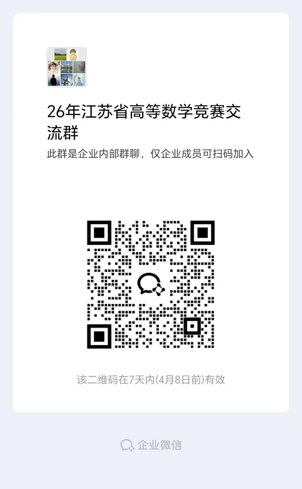 为助力参赛学子备战省级竞赛,数学学院数学竞赛教练组将于4月至5月期间开展系统性培训工作。线下集中培训的具体时间、地点,将通过上述企业微信群统一通知,请相关同学密切关注群内消息。