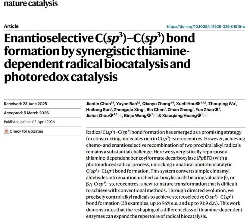 作者:Jianlin Chun, Yuyan Bao, Qiaoyu Zhang, Xueli Hou, Zhouping Wu, Hailong Sun, Zhongqiu Xing, Bin Chen, Zihan Zhang, Yue Zhao, Jiahai Zhou, Binju Wang, Xiaoqiang Huang题目:Enantioselective C(sp³)–C(sp³) bond formation by synergistic thiamine-dependent radical biocatalysis and photoredox catalysis期刊:Nature CatalysisDOI:10.1038/s41929-026-01515-w