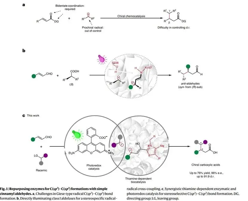 自由基C(sp³)–C(sp³)键形成是构建富含手性碳中心分子的重要策略,但实现两个前手性烷基自由基的化学选择性与立体选择性重组仍是有机合成领域的重大挑战。传统的Giese型自由基共轭加成反应通常需要双齿配位底物来控制立体化学,且对前手性碳自由基的有效调控较为困难。尽管近年来化学催化在不对称自由基反应方面取得进展,但利用生物催化剂的高选择性与可进化性来解决这一难题,特别是直接利用简单的单齿烯烃底物(如肉桂醛)进行立体选择性自由基偶联,仍具有重要研究价值。