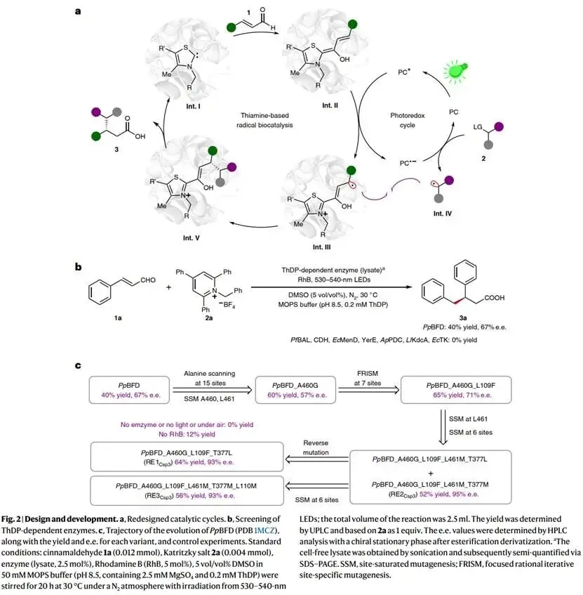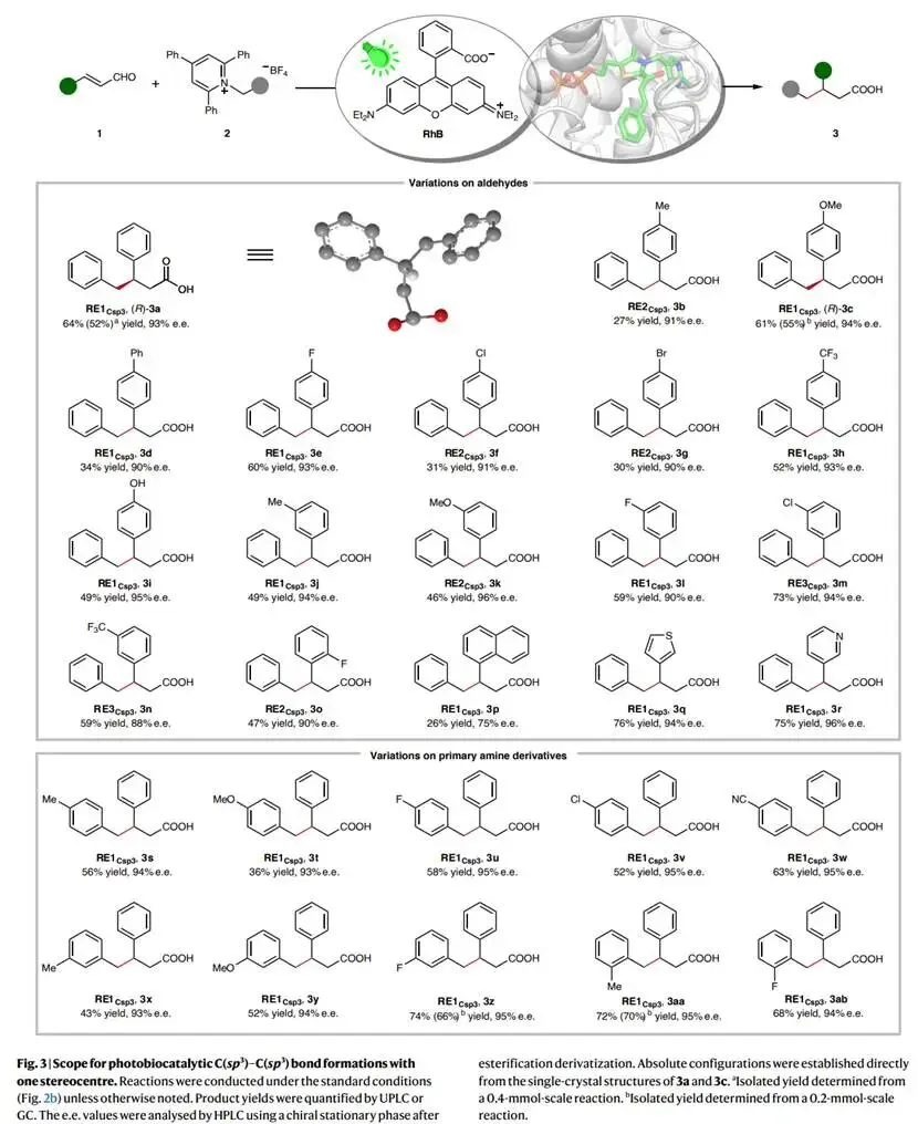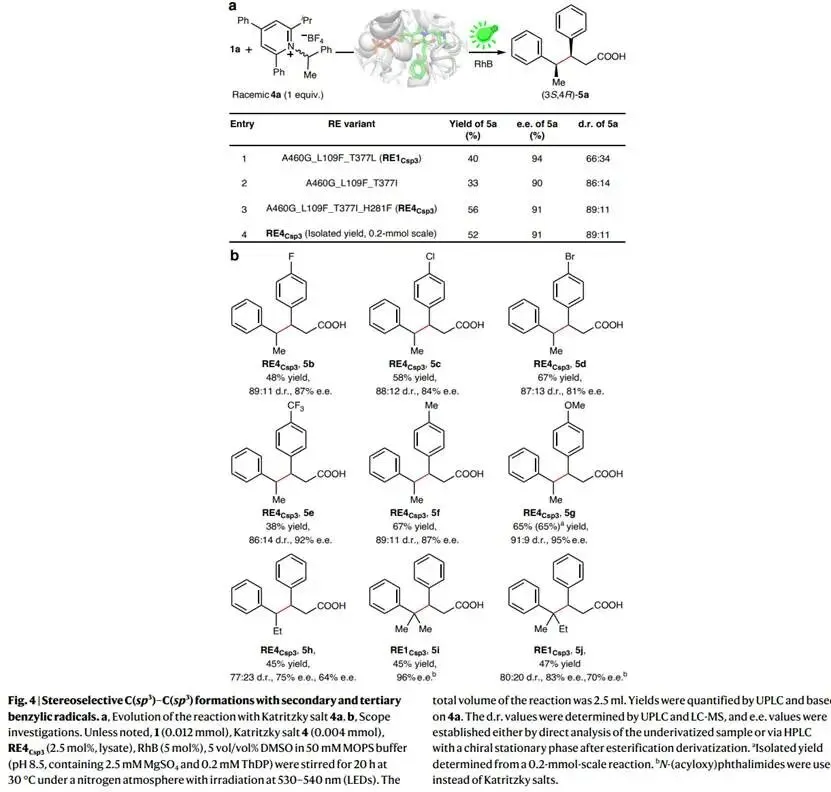 研究以肉桂醛(1a)和Katritzky盐(2a)为模型底物、罗丹明B(RhB)为绿色光敏剂,筛选发现野生型PpBFD能以40%产率和67%对映选择性(ee)生成目标产物,且表现出优异的化学选择性(无ipso-加成副产物)。通过多轮定向进化,包括位点饱和突变(SSM)、丙氨酸扫描及聚焦理性迭代位点特异性突变(FRISM)策略,关键突变位点A460、L109、L461和T377被逐步鉴定。最终获得的最优突变体RE1Csp3 (A460G/L109F/T377L)可将产物3a的产率提升至64%,ee值达93%;而针对双立体中心构建的RE4Csp3 (A460G/L109F/T377I/H281F)则实现了89:11的非对映选择性(dr)和91% ee。