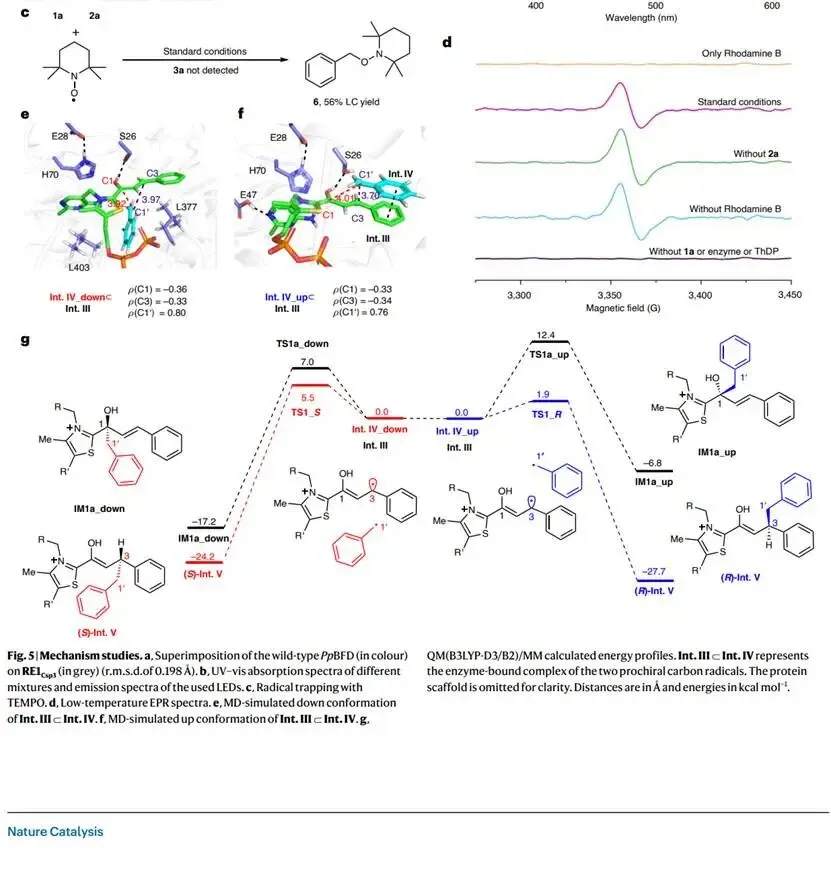 通过蛋白质晶体结构、光谱学实验和理论计算相结合,详细阐明了催化循环机制。晶体结构显示RE1Csp3中L109F和T377L突变使活性口袋从8.0 Å缩小至5.1 Å,增强了手性环境控制。UV-vis光谱证实了酶-底物Breslow中间体(Int. II)的形成;低温EPR检测到酶结合自由基(Int. III)信号;自由基捕获实验(TEMPO)验证了游离烷基自由基(Int. IV)的存在。QM/MM计算表明,Int. IV在活性口袋内采取"向上"(up)和"向下"(down)两种构象,前者通过π-π堆积作用稳定,其C1'–C3偶联能垒(1.9 kcal/mol)显著低于后者(5.5 kcal/mol),这与实验观察到的(R)构型优势一致,且C(sp³)–C(sp³)路径能垒低于C(sp²)–C(sp³)路径,解释了化学选择性来源。