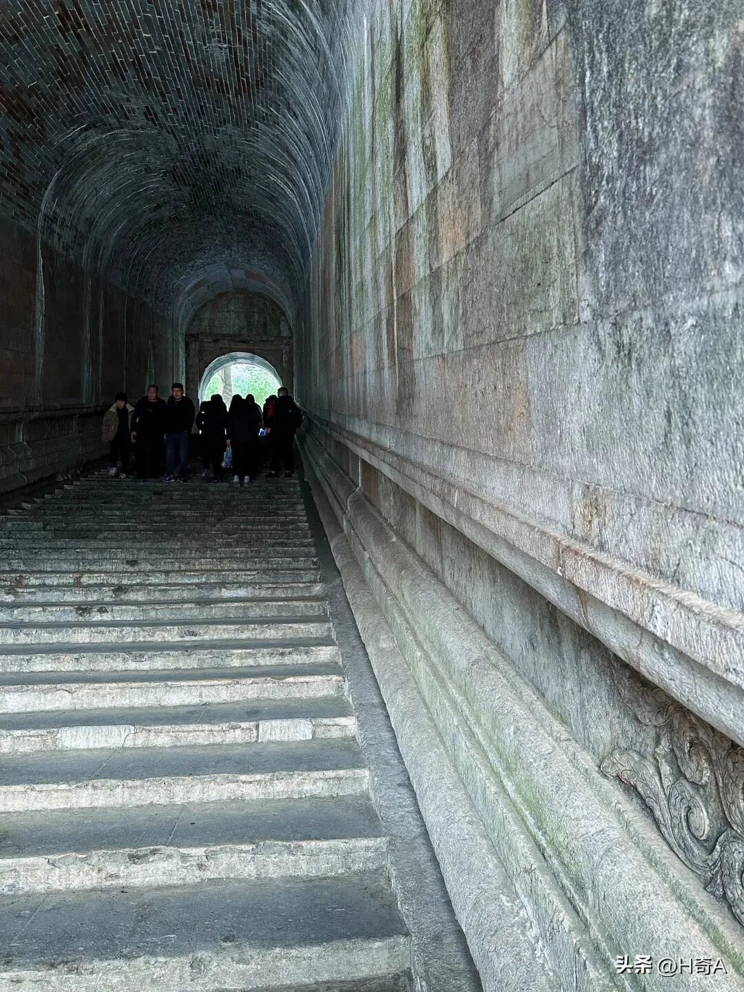 方城正中有一个券门,门内是一条幽深的隧道,五十四级台阶向上延伸。隧道右边墙上有一块刻石,写着:“民国十五年八月二十九日余杭章炳麟、腾冲李根源、崇明徐兰墅同谒孝陵记于隧中”——国学大师章太炎也曾在这里留下足迹。
