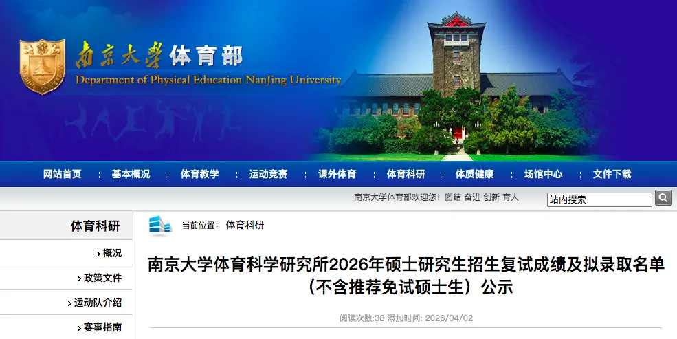 日前,南京大学体育部官网公示下属机构体育科学研究所2026年硕士研究生招生复试成绩及拟录取名单(不含推荐免试硕士生)。赵旭昕、张润旸两名考生拟录取到体育教育与训练学专业。