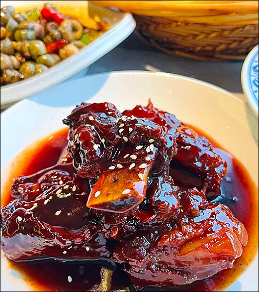 酱排骨:颜色红亮,骨酥肉软,甜味不是冒头,是慢慢往骨头里走。