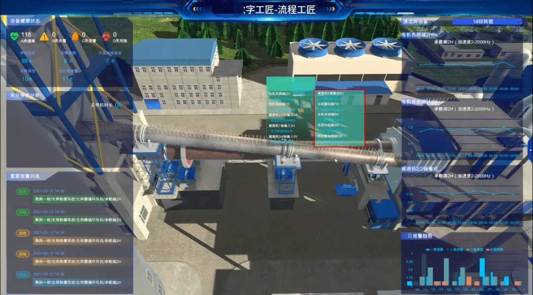 2. 管线级拓扑:水泥厂最让人头疼的莫过于“蜘蛛网”般的管网——风管、料管、煤粉管、电缆桥架。华智星团队花费数月时间,梳理了全厂的工艺流程图(P&ID),在三维场景中精准还原了每一条关键管线的走向与连接关系。当某个传感器报警时,管理人员可以立即追溯上下游管线的关联影响,彻底告别“头痛医头,脚痛医脚”。