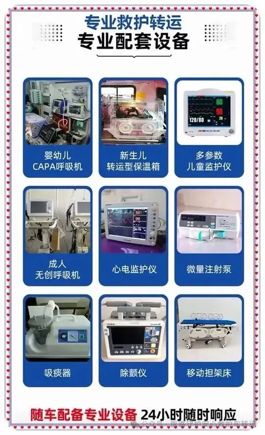 专业设备和服务:车辆配备全自动担架车、新生婴儿保温箱、氧气、呼吸机、心电监护仪、AED除颤器、吸痰器、多通道微量注射泵等专业医疗设备,且随车配有2名专业司机和执业医生和护士,24小时服务。
