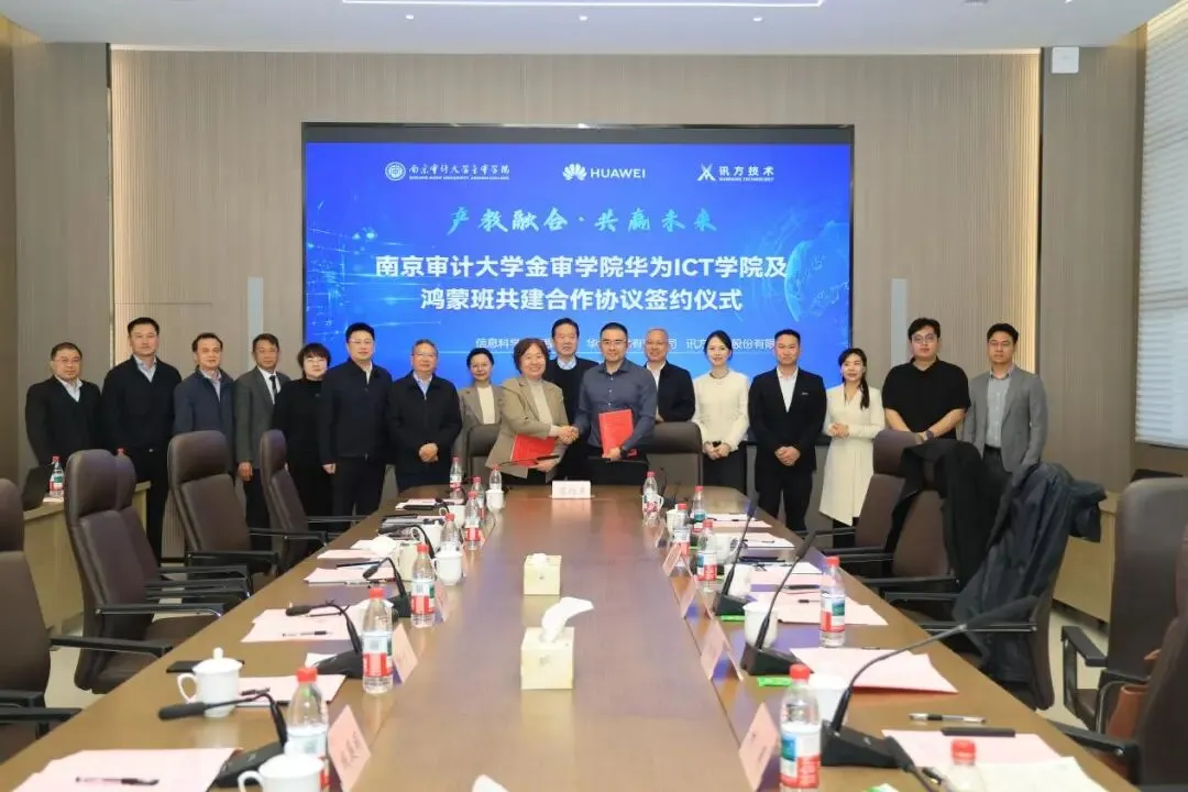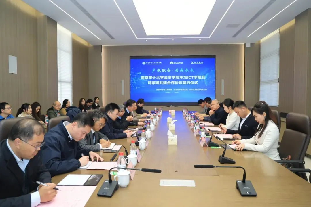 4月1日下午,南京审计大学金审学院华为ICT学院及鸿蒙班共建合作协议签约仪式在学校图书馆一楼会议室隆重举行。南京审计大学金审学院、深圳市讯方技术股份有限公司与华为技术有限公司三方携手,共建华为ICT学院与鸿蒙班,并同步启动鸿蒙全栈全场景实训室建设。各方以产教融合、校企协同、资源共享、共赢发展为宗旨,聚力打造ICT与鸿蒙生态人才培养高地,共同开启服务数字中国战略、培育高素质应用型人才的崭新篇章。