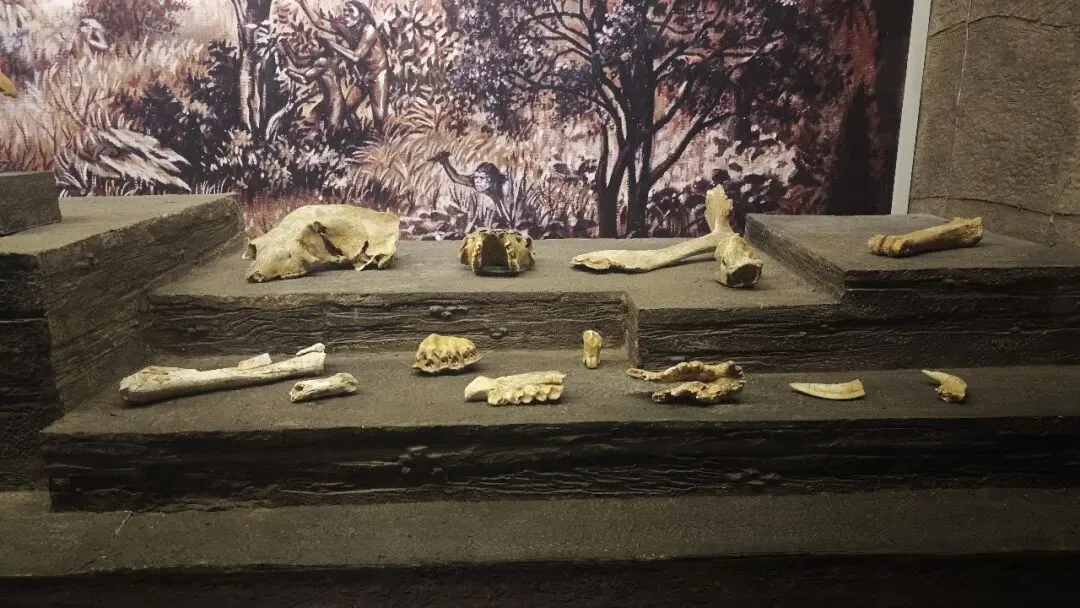 这是南京史前遗址出土的古动物骨骼化石,包括兽类的头骨、下颌骨、肢骨等。