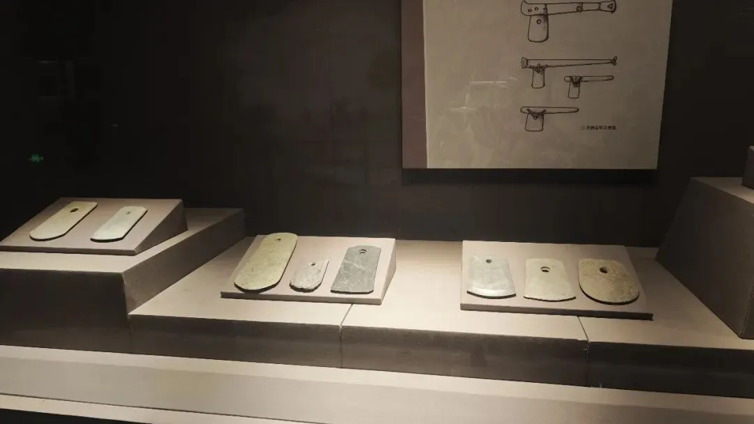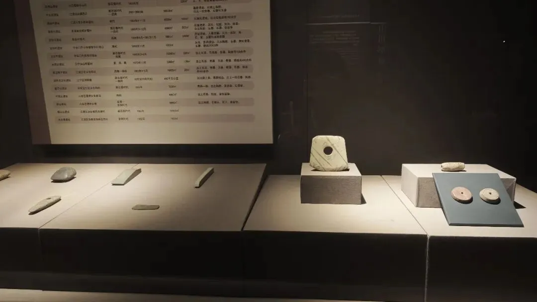 展台上是各类史前石器:石斧、石锛、石纺轮、石球等,涵盖了生产、生活、装饰等多个功能,是南京先民从狩猎采集走向农耕定居的实物见证。