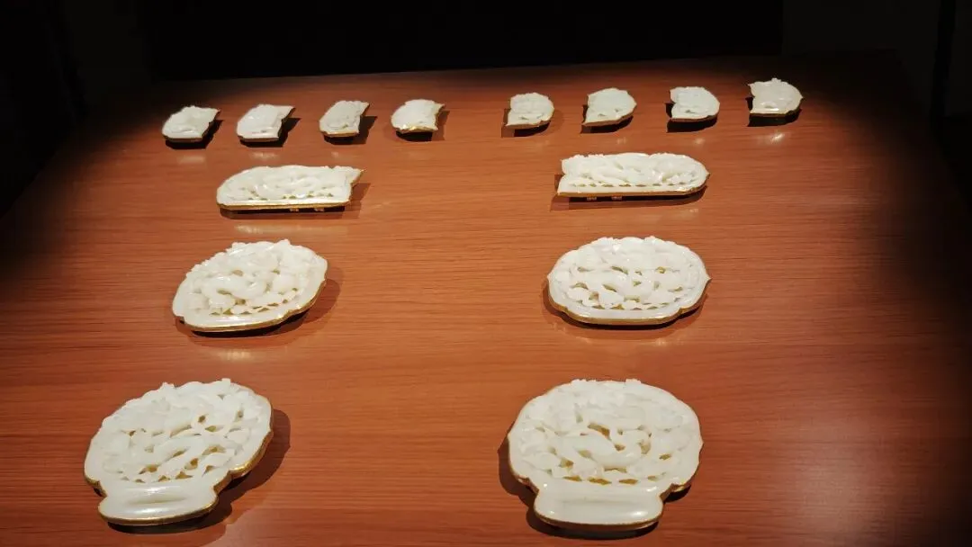 釉里红,以铜红釉在胎上绘画,施透明釉后高温烧成,是元代以来的名贵釉种。岁寒三友(松、竹、梅),辅以菊花、芭蕉,象征君子高洁、坚韧不拔,是文人瓷的核心题材,也是清代 “君子吉祥” 的代表纹饰。一套明代白玉镂雕龙纹带板,由多块玉片组成,这套带板采用顶级和田白玉,透雕工艺精湛,龙纹造型矫健,是明代玉器的巅峰之作。