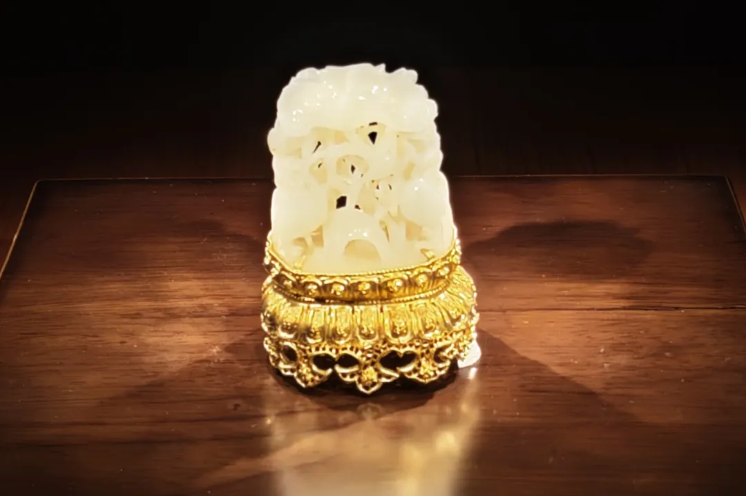 这件是明代金镶玉镂雕炉顶,白玉部分采用多层透雕工艺,底座为累丝金托,工艺精美。炉顶是古代香炉盖的钮饰,这类器物是明代文房雅玩的代表,体现了明代贵族的审美与工艺水平。
