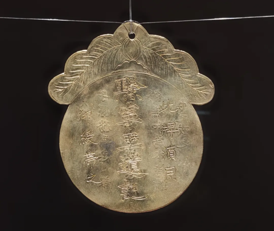 这是南京博物馆的顶级国宝,1974 年出土于沐英第十一世孙沐启元墓。形制为纯金打造,直径 13 厘米,重 108.4 克,顶部饰蕉叶纹,有穿孔用于佩戴。