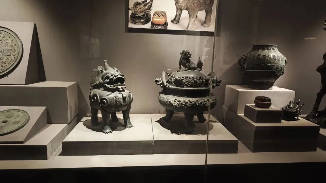 展柜中是多件古代铜质香具与礼器,涵盖汉唐宋明多个时期,左侧的铜镜、右侧的小香盒,也都是古代贵族的日用雅器,反映了中国古代的香文化与铜器工艺。