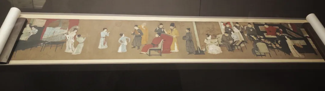 这幅是五代十国・南唐顾闳中的传世名作,描绘南唐大臣韩熙载家中夜宴、听乐、观舞、休憩、送别等场景。原作现藏北京故宫博物院,展厅里这件是高精度复制品。