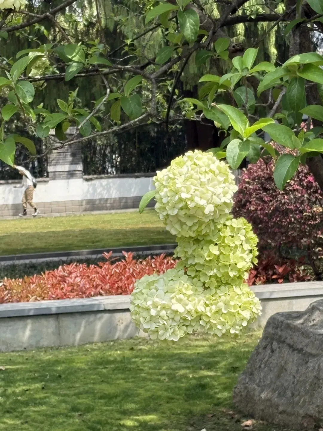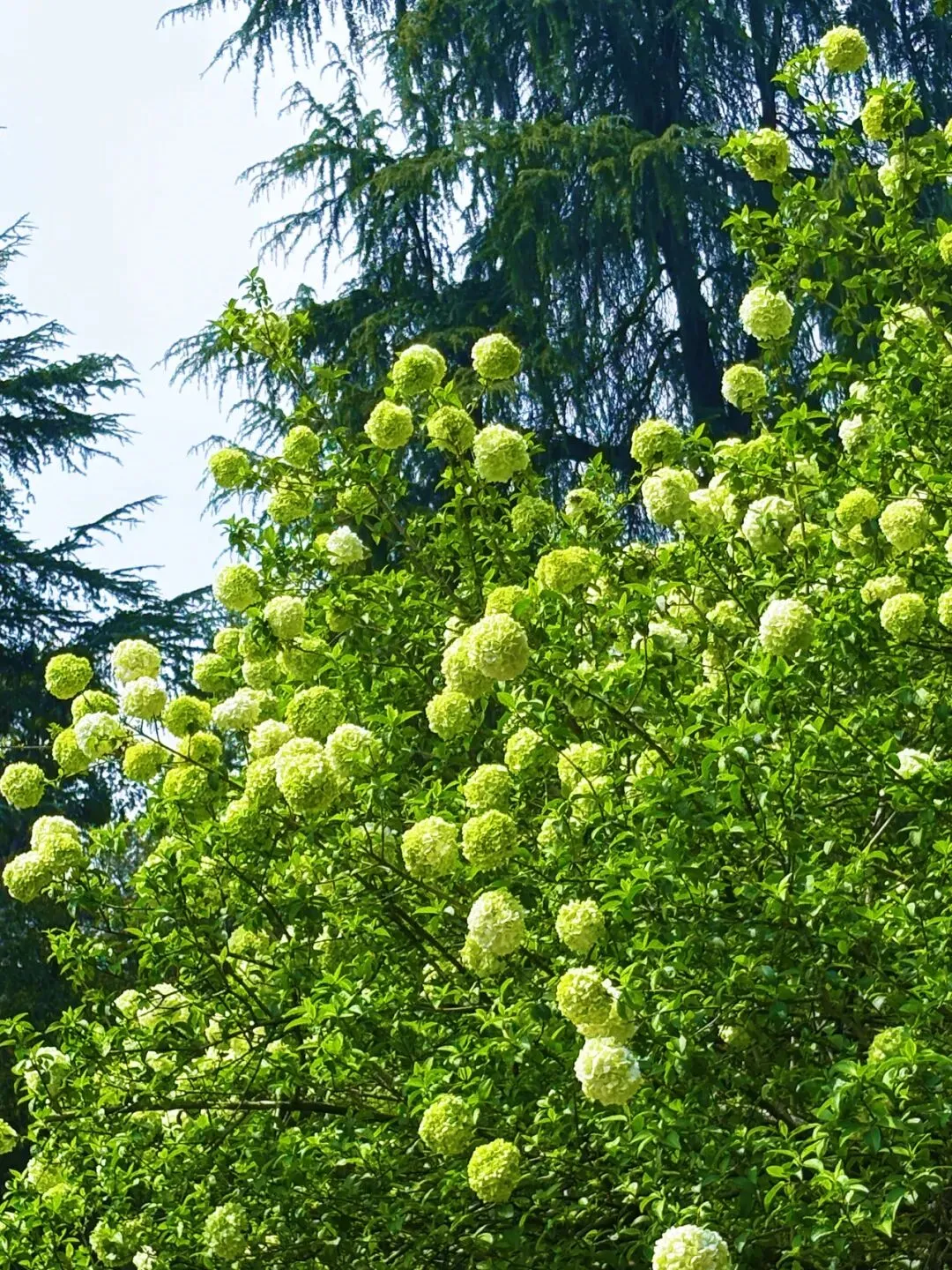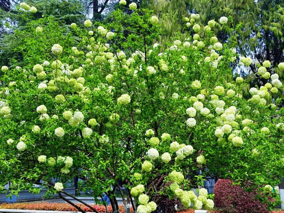第一站,直奔妮推荐的午朝门公园,园内的中华木绣球给了我们大大的惊喜。600多年的古城墙静静矗立,斑驳的石础与古朴宫墙,藏着岁月的沧桑,而团团簇簇的中华木绣球,就开在这古韵之间,青绿渐次晕染成奶白,硕大的花球缀满枝头,像漫天飞雪落满枝头,又似天然织锦,温柔又治愈。漫步在古老的城楼之上,脚下是厚重的历史,眼前是盛放的繁花,风轻轻拂过,花影摇曳,时光都变得缓慢起来,一砖一瓦,一花一叶,写满了金陵独有的浪漫。