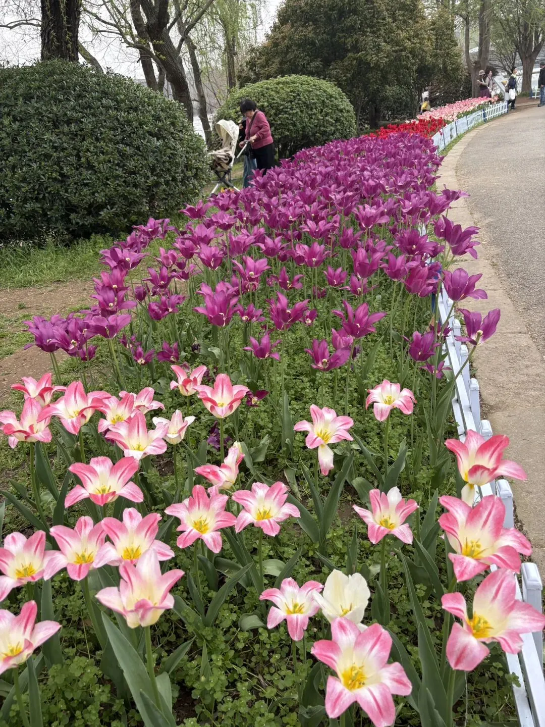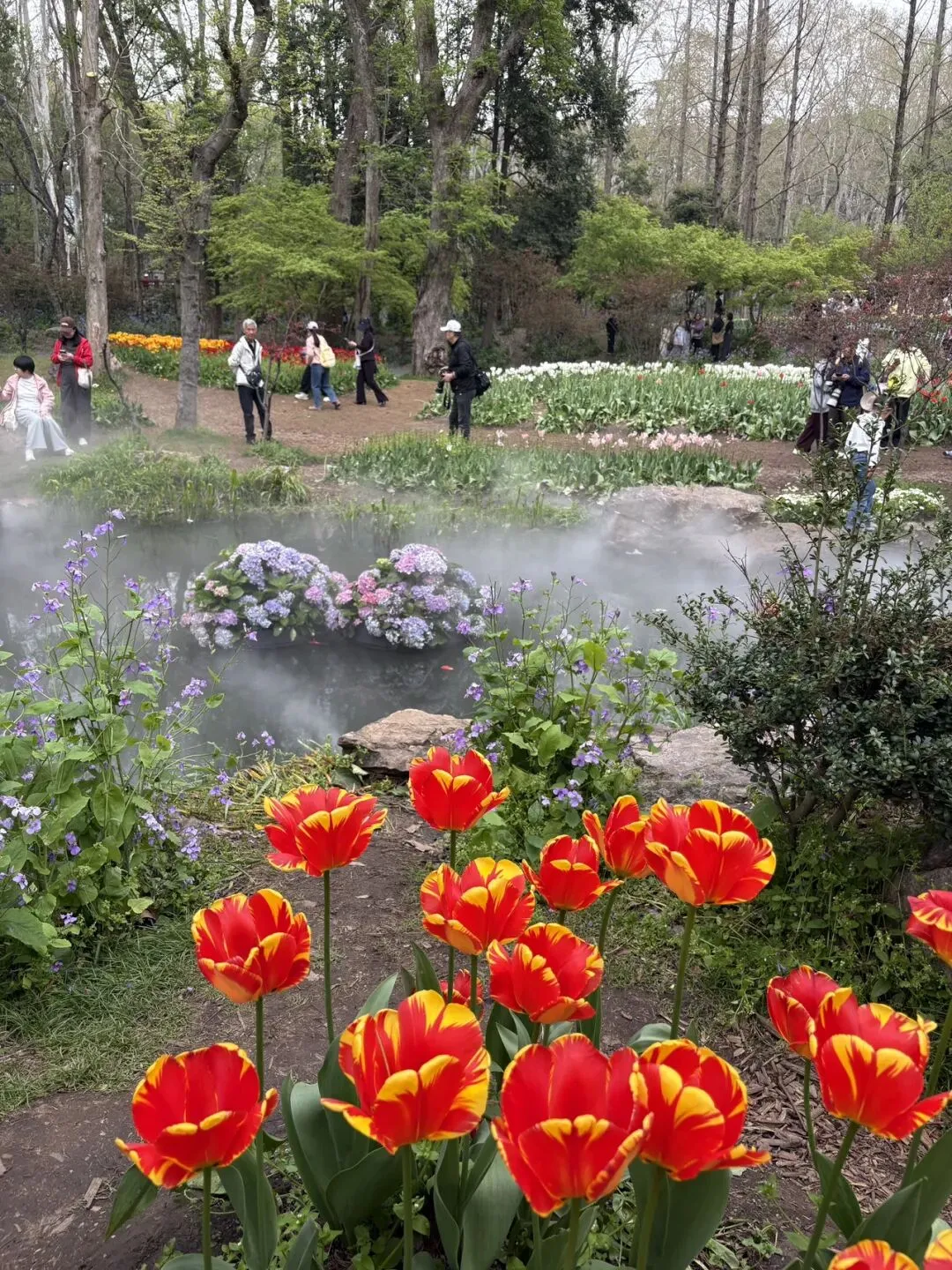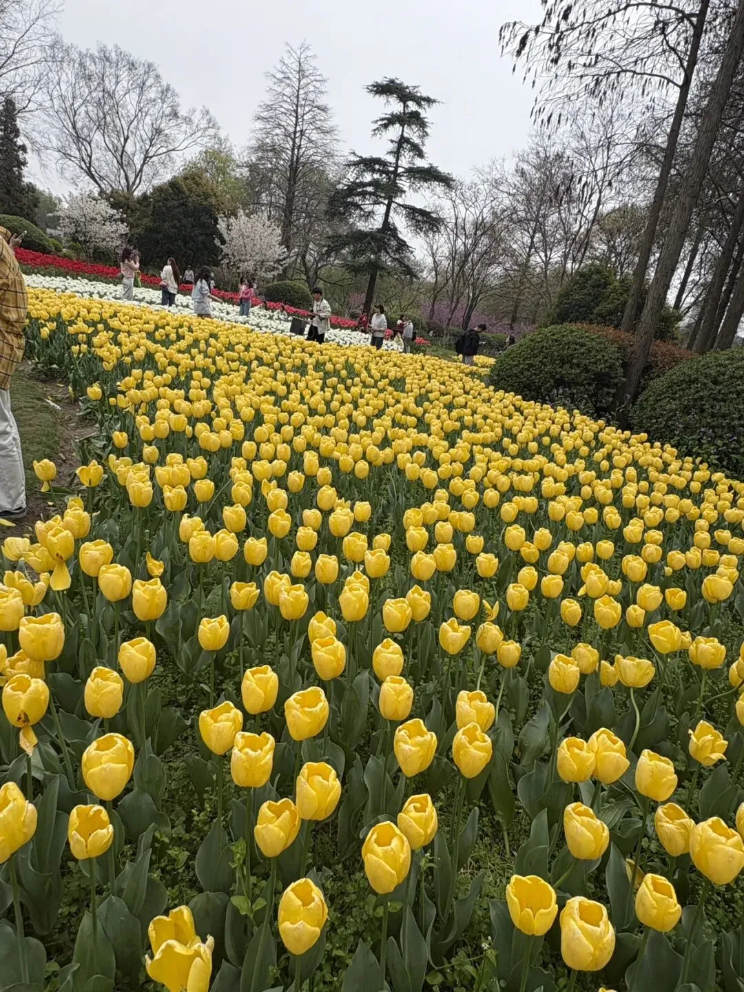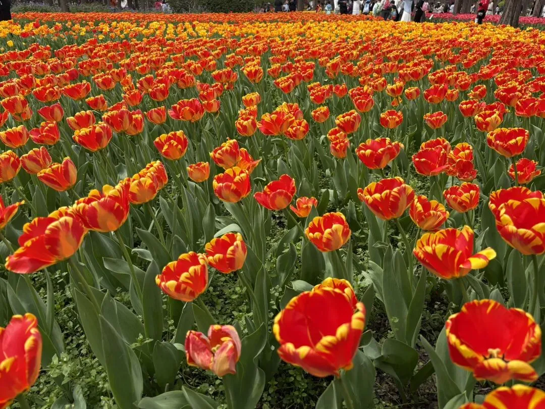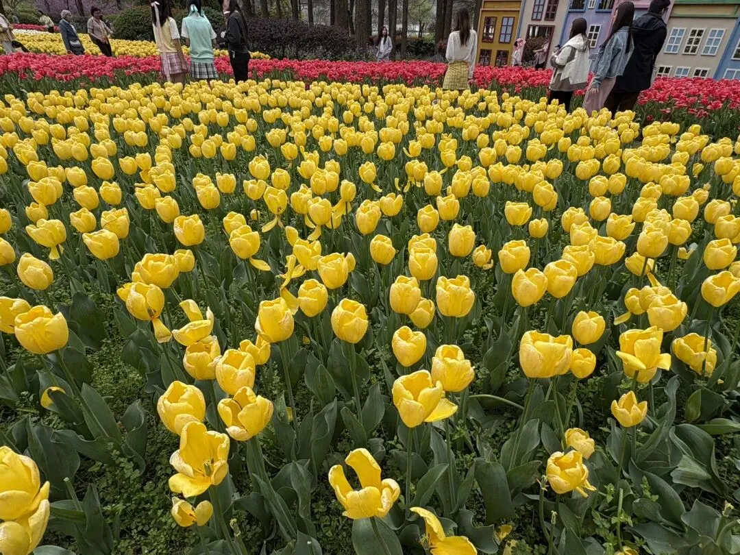稍作休整后,我们奔赴下一场春日盛宴——中山植物园。一进园区,便被眼前的景色狠狠惊艳到,近40万株郁金香竞相绽放,40多个品种、十几种色彩层层叠叠,粉的温柔、红的热烈、黄的明媚、紫的浪漫,像打翻了大自然的调色盘,绘就了一幅绝美的春日油画。园内游人如织,却丝毫不减这份秀美,郁金香顺着溪流、湖畔肆意铺展,搭配着灵动的绿植,打造出宛若童话仙境般的花境,漫步其中,仿佛闯入了莫奈笔下的花园,每一步都是风景,每一眼都是治愈。