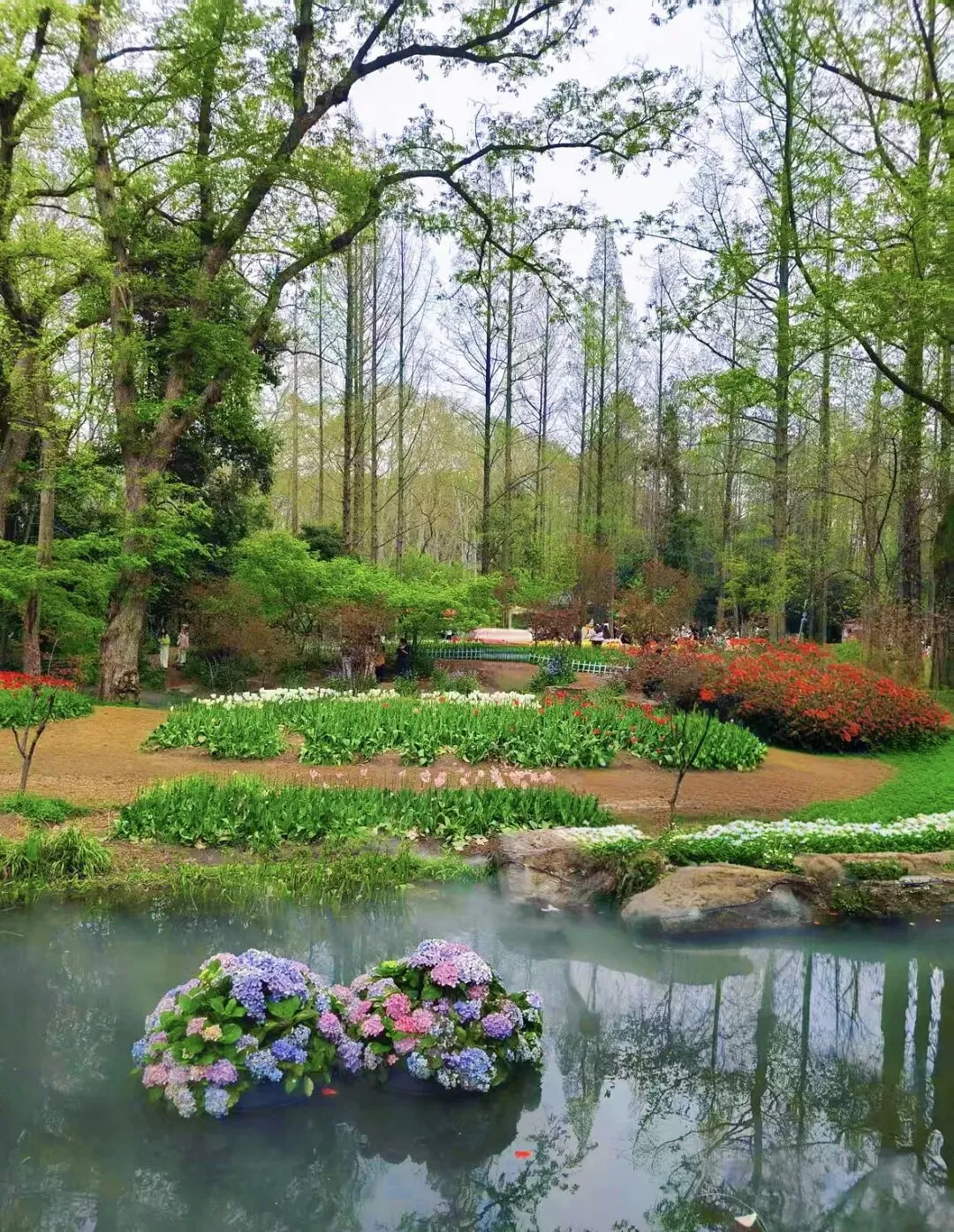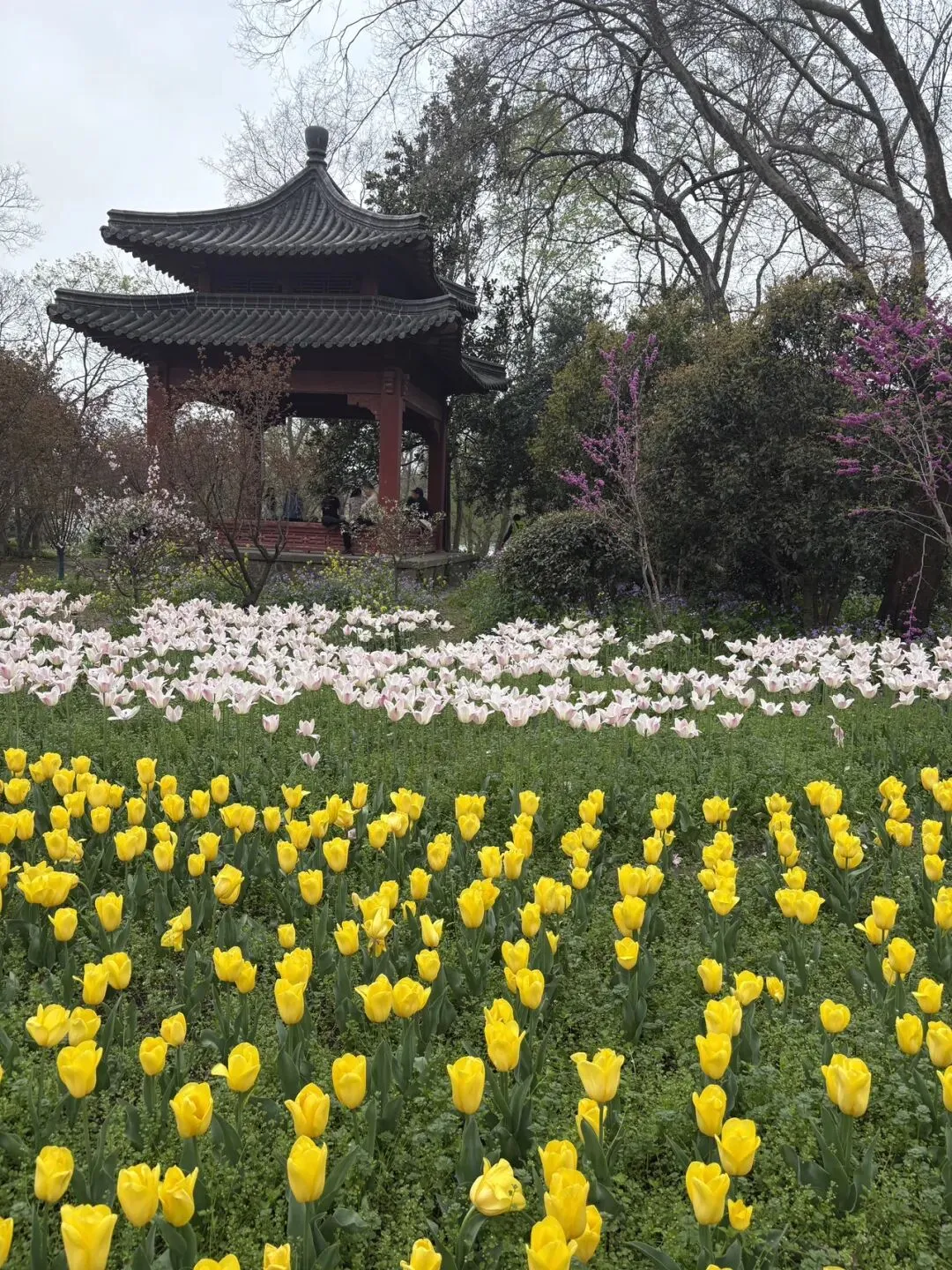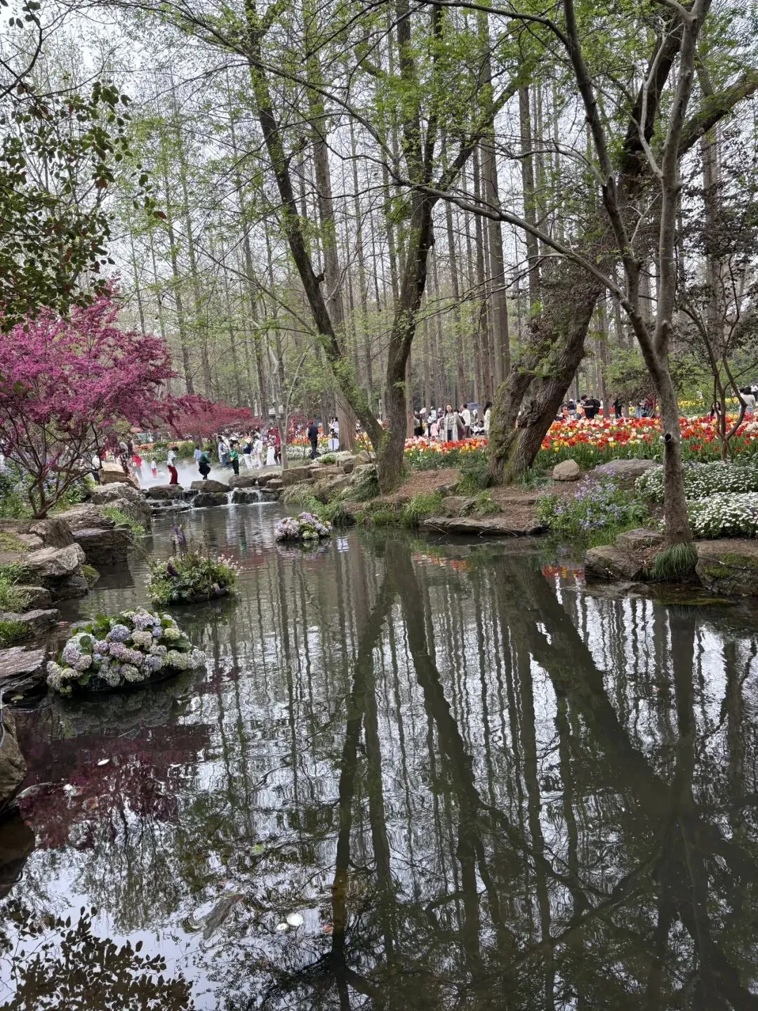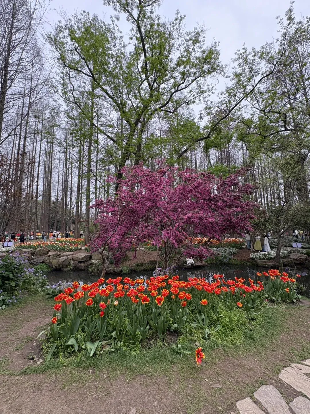 稍作休整后,我们奔赴下一场春日盛宴——中山植物园。一进园区,便被眼前的景色狠狠惊艳到,近40万株郁金香竞相绽放,40多个品种、十几种色彩层层叠叠,粉的温柔、红的热烈、黄的明媚、紫的浪漫,像打翻了大自然的调色盘,绘就了一幅绝美的春日油画。园内游人如织,却丝毫不减这份秀美,郁金香顺着溪流、湖畔肆意铺展,搭配着灵动的绿植,打造出宛若童话仙境般的花境,漫步其中,仿佛闯入了莫奈笔下的花园,每一步都是风景,每一眼都是治愈。