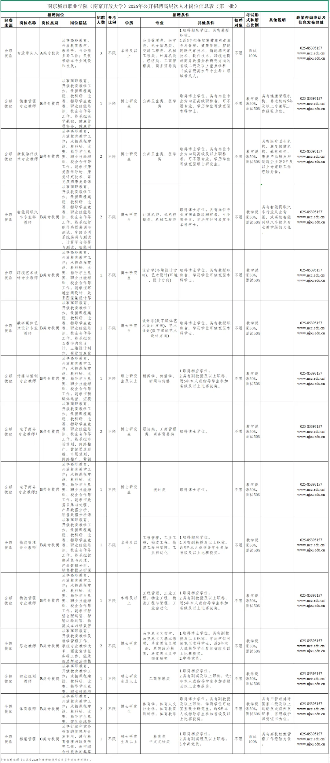 本次招聘相关信息在南京市人力资源和社会保障局网站(http://rsj.nanjing.gov.cn)、南京城市职业学院网站(http://www.ncc.edu.cn)和南京开放大学网站(http://www.njou.edu.cn)发布,具体的招聘岗位、数量、资格条件等详见附件1《南京城市职业学院(南京开放大学)2026年公开招聘高层次人才岗位信息表(第一批)》(以下简称《岗位信息表(第一批)》)。