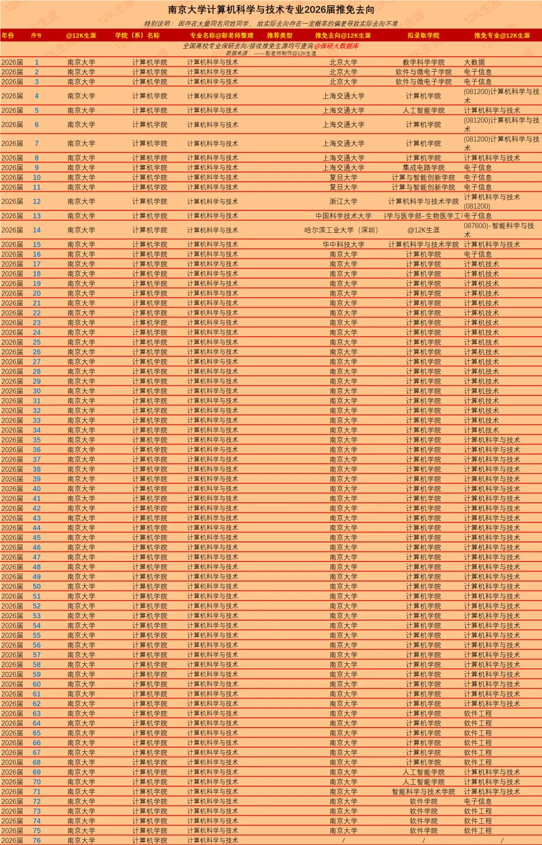 南京大学计算机科学与技术专业2026届有本科毕业生181人;76人获得推荐免试资格;专业平均推免率为:42.0%