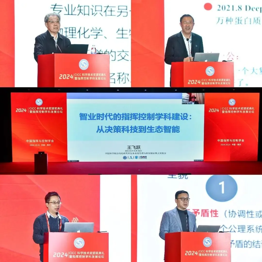 颁奖典礼期间召开了“2024指挥控制学科发展论坛”,戴浩院士发表题为《C2学科建设的若干问题》的主题报告,为我们深入解析指挥与控制学科的建设与发展。浙江工业大学的王万良教授、河南理工大学的钱洪伟教授、中科院自动化研究所的王飞跃研究员、国防科技大学肖卫东教授分别围绕“智能科学与技术的学科发展和人才培养探索与实践”“指挥控制学科赋能应急指挥能力建设路径”“智业时代的指挥控制学科建设:从决策科技到生态智能” “指挥控制学科与理论问题探讨” 做了报告,为我们提供指挥控制学科的理论与实践相结合的深刻洞察。