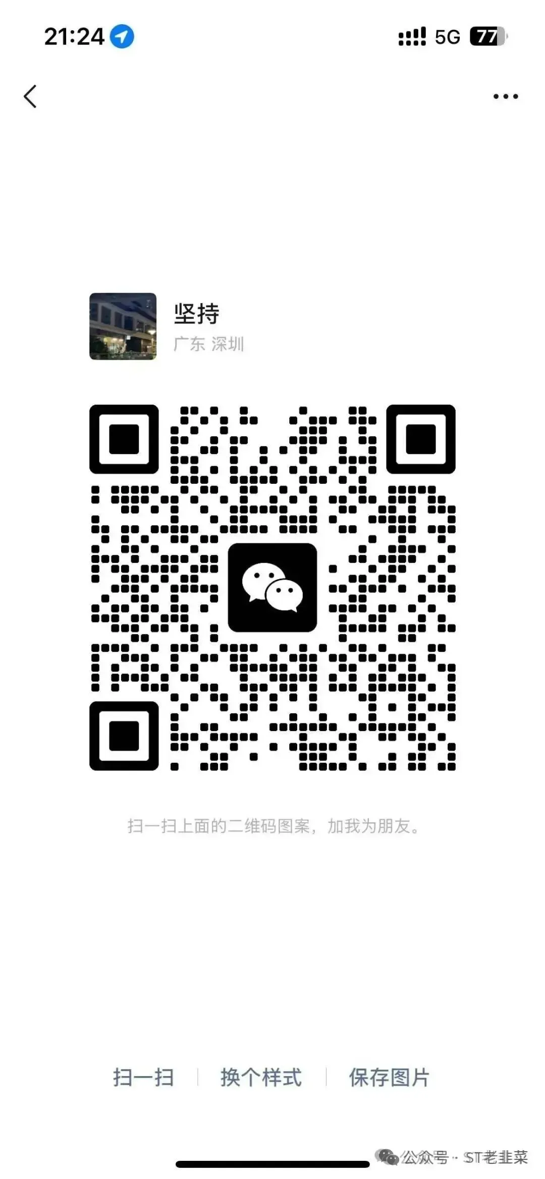 以下是交流平台广告:上周提到建群的事,有很多老师私信希望有群可以交流。现在大佬坚持哥建了一个微信群,名曰ST投机观察营,有意加群的老师请加坚持哥的微信: