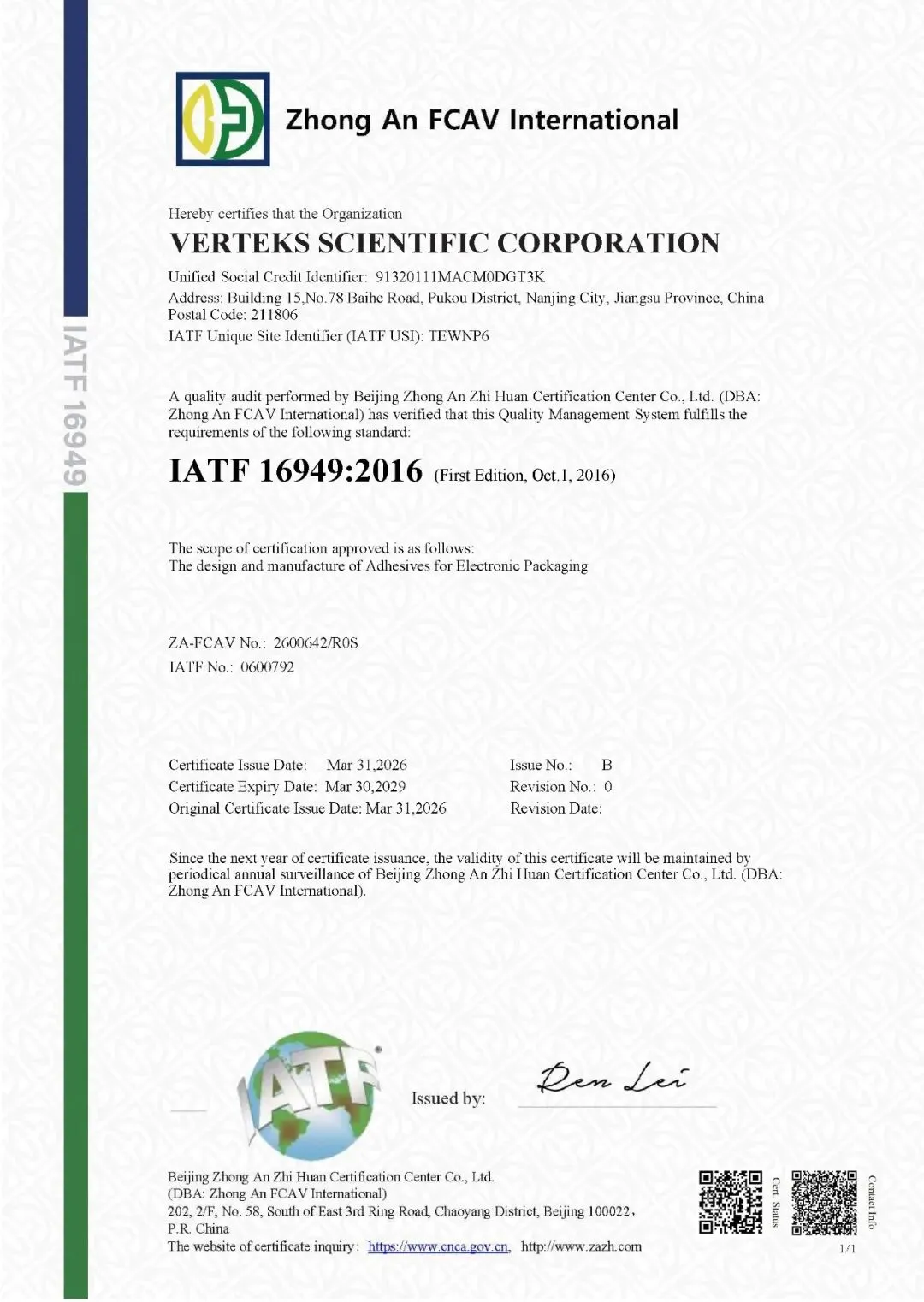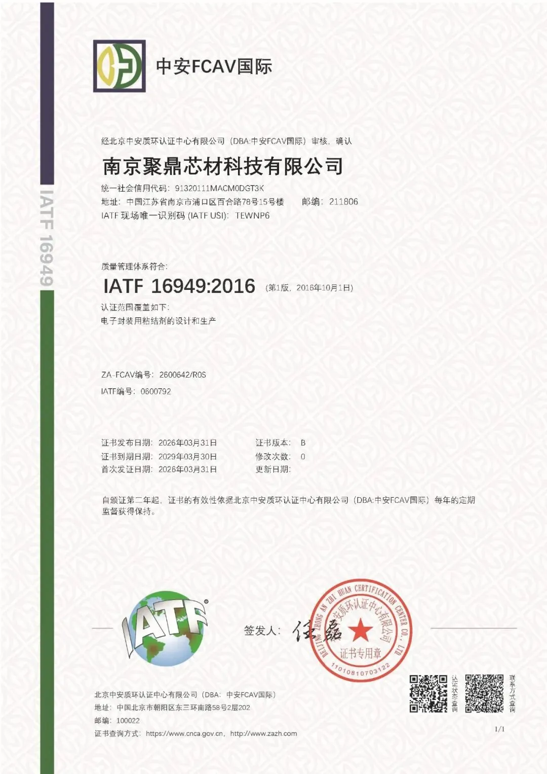 >祝贺南京聚鼎芯材科技有限公司通过IATF16949:2016体系认证!