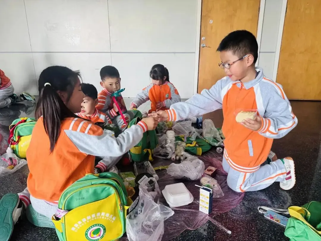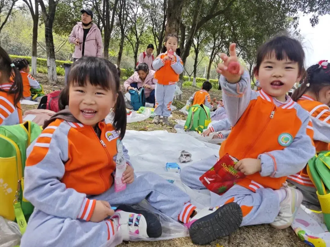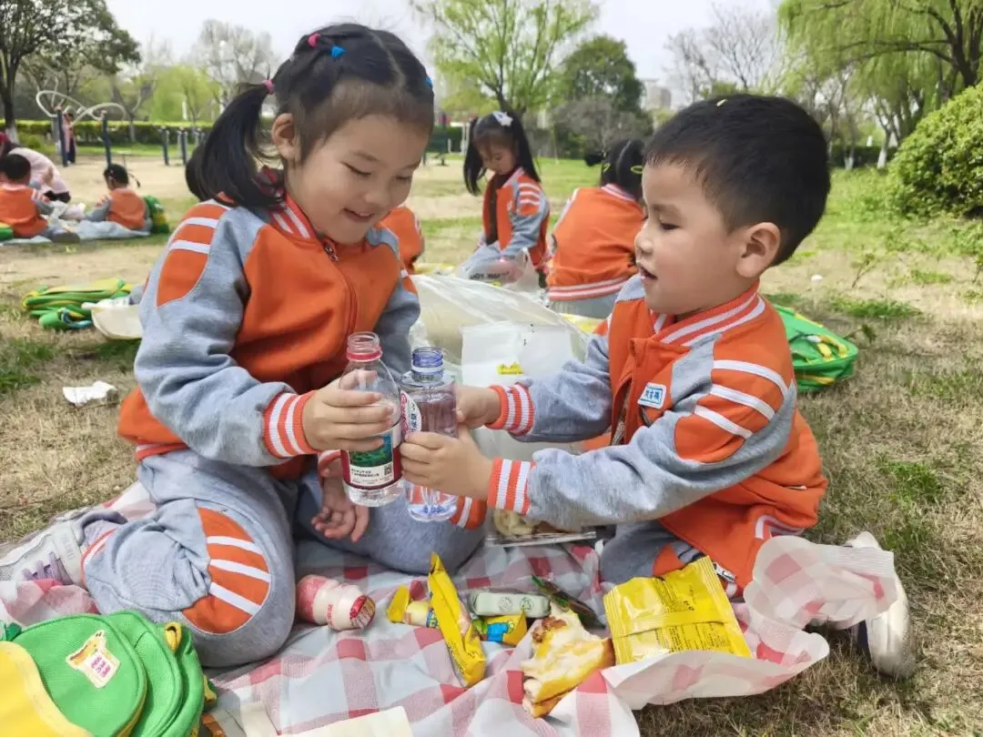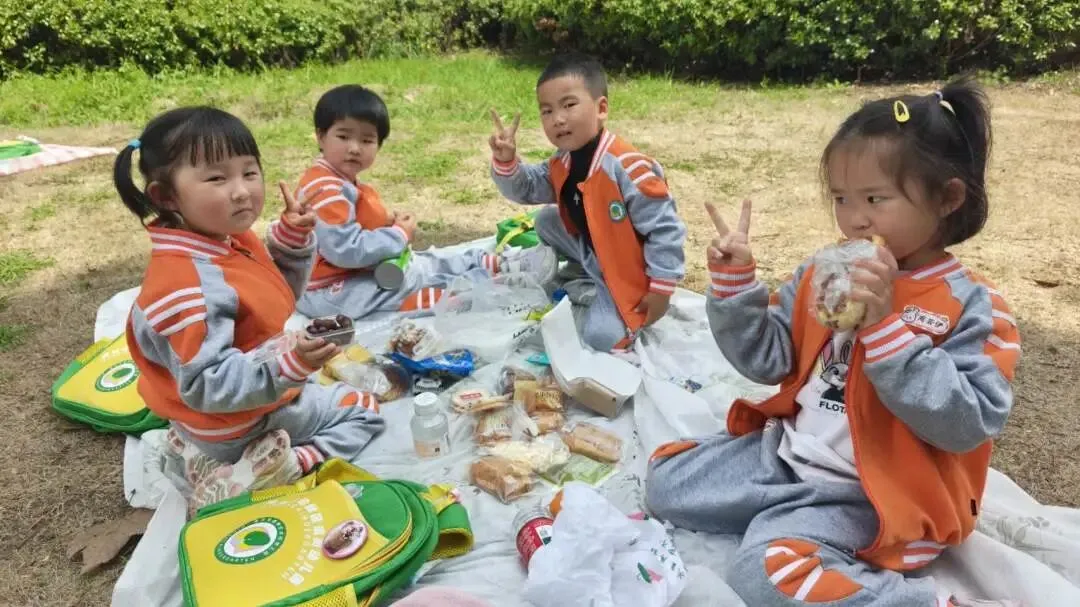 阳光和煦,微风轻柔,快乐的野餐时光温馨开启。孩子们围坐在一起,共享舌尖美味。结束后小朋友主动整理垃圾,养成了爱护环境的好习惯。