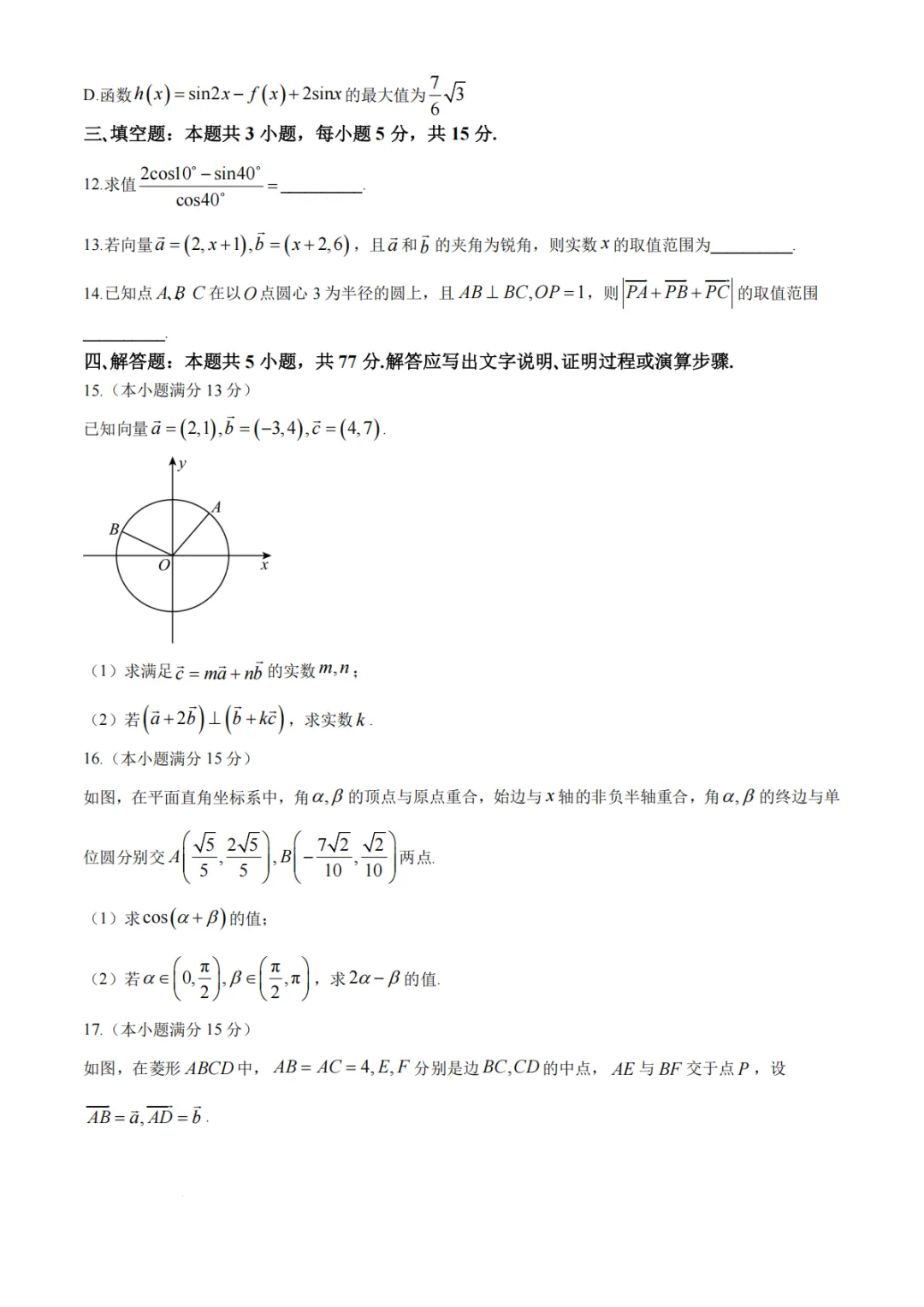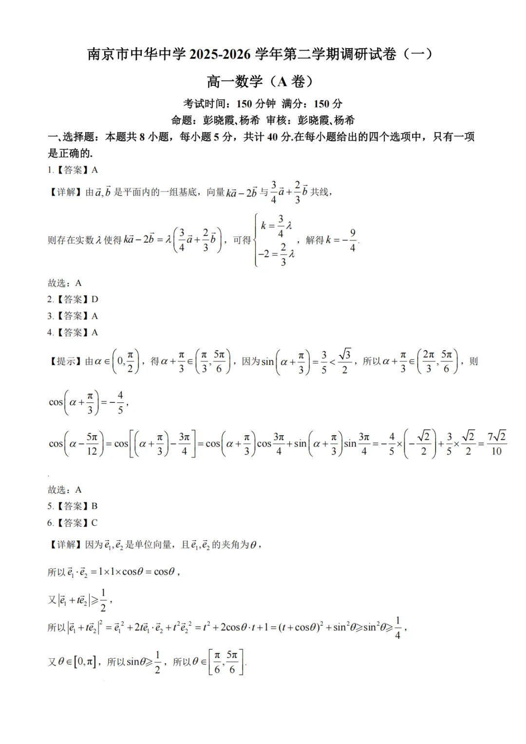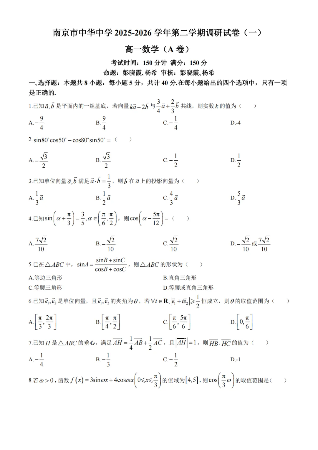 >【高中数学试卷】江苏南京市中华中学2025-2026学年高一下学期调研试卷(一)数学试题+答案