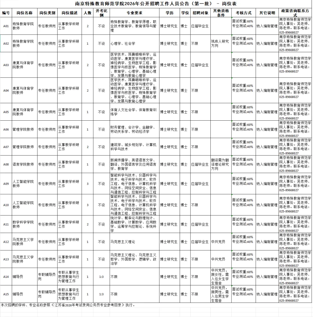南京特殊教育师范学院2026年公开招聘工作人员公告(第一批)-岗位表.xlsx