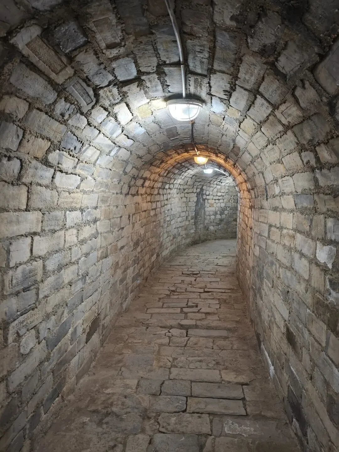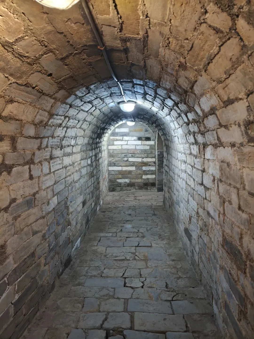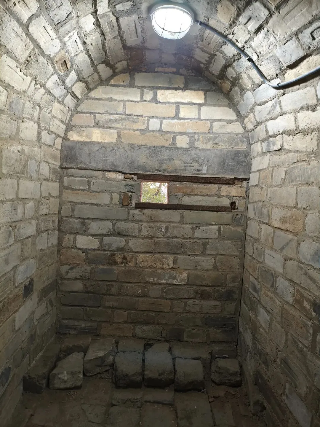 富贵山段的特别,先藏在“山藏城墙”的内部构造里。多数明城墙是“外砖内土”,而这里依托钟山余脉,将墙体嵌入山体,内部开凿出蜿蜒甬道与地下室,堪称“地下秘境”。实地参观时,登城无需直上,需先步入一段昏暗甬道——这是民国防御工事改造的防空洞,老城砖砌筑的墙面斑驳,拱券技术依旧扎实,两侧瞭望口、射击位与油灯壁龛,触手可及历史肌理。