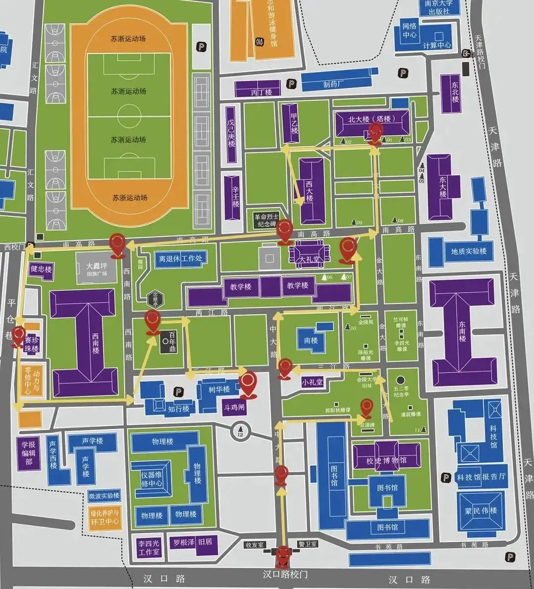 路线:汉口路校门 → 中大路(梧桐大道)→ 小礼堂 → 大礼堂 → 北大楼 → 东大楼/西大楼 → 二源壁 → 革命先烈碑 → 大纛坪 → 赛珍珠纪念馆 → 百年鼎 → 斗鸡闸(何应钦公馆)