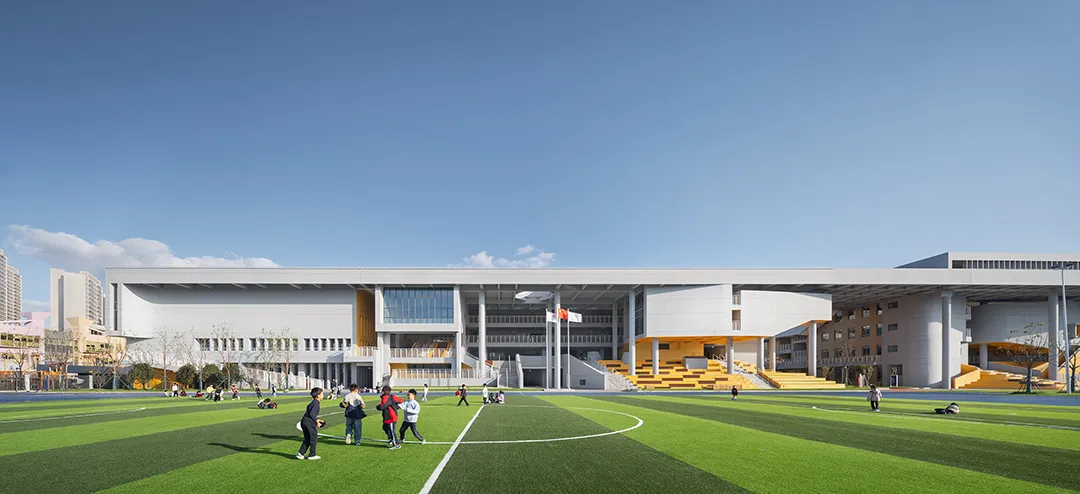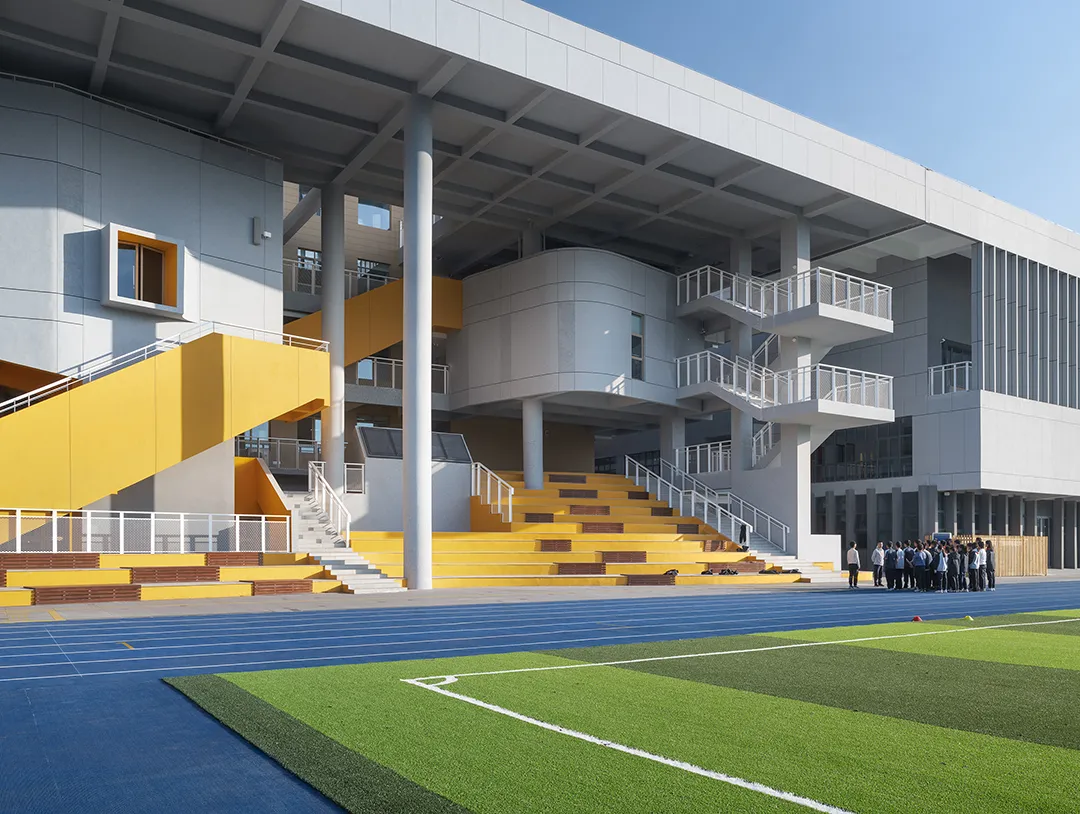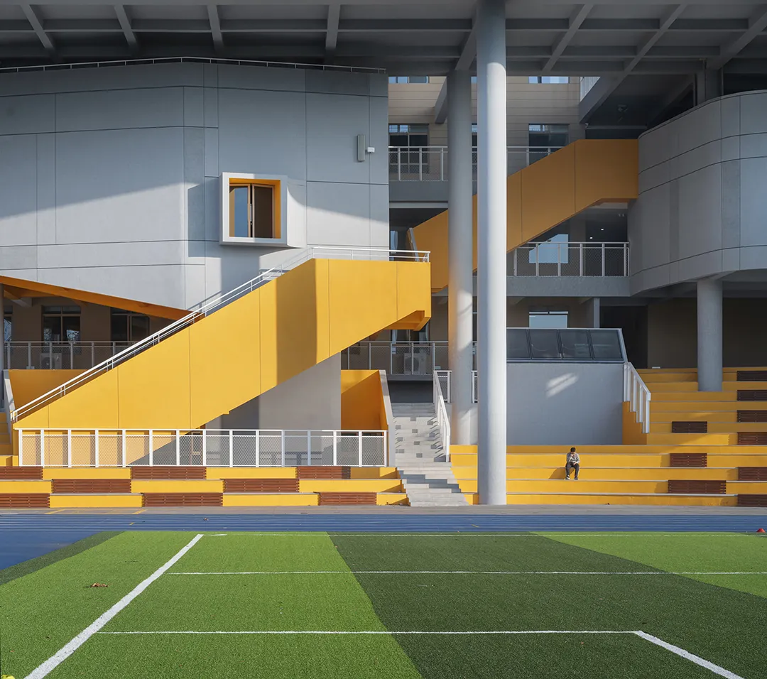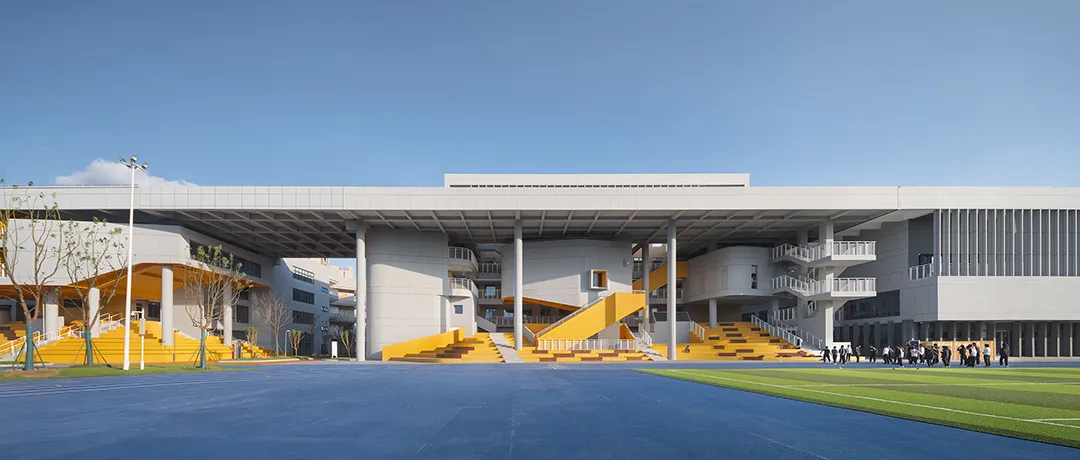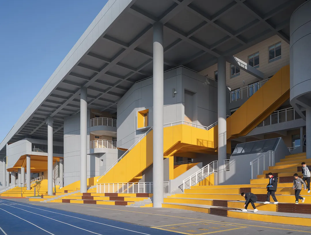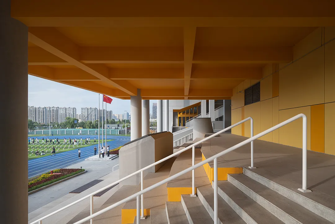 学校最好的呈现就是内部空间的外显,没有一个画面会比有实在学生活动的场景更加动人。建筑西侧隔着操场面向城市的干道,“剖切开”的建筑是最好的学习场景的展现。