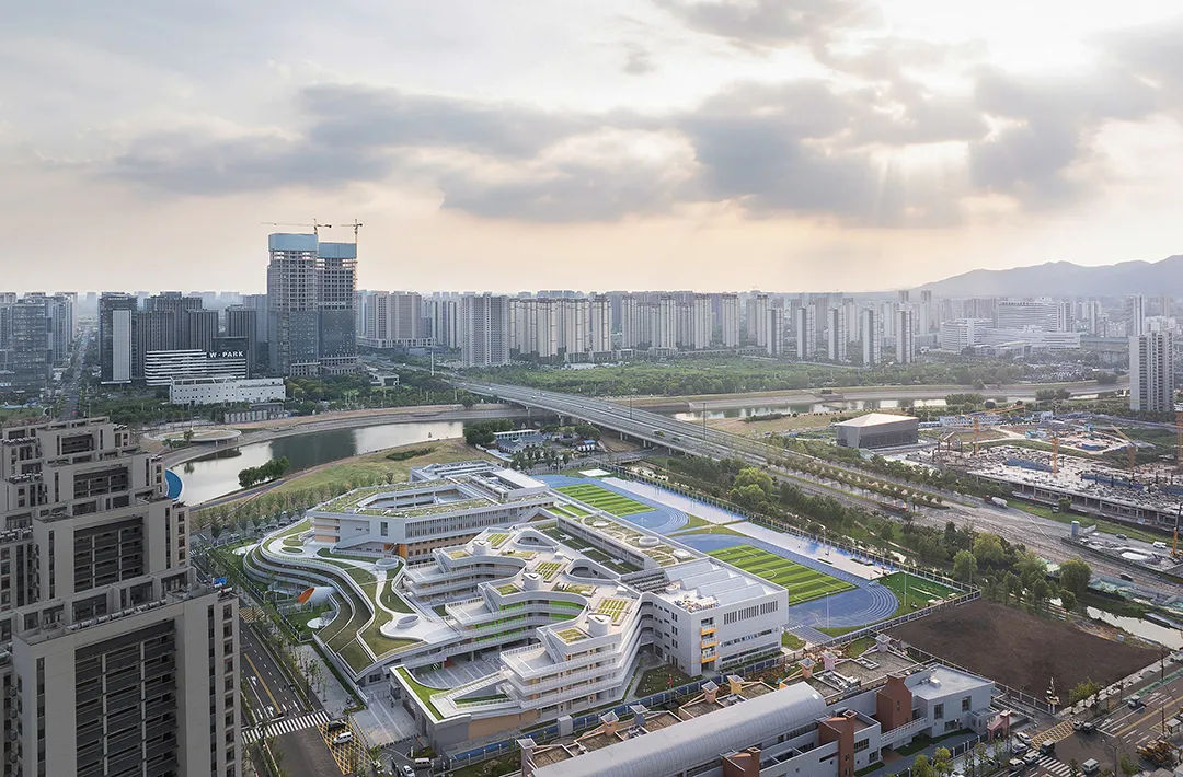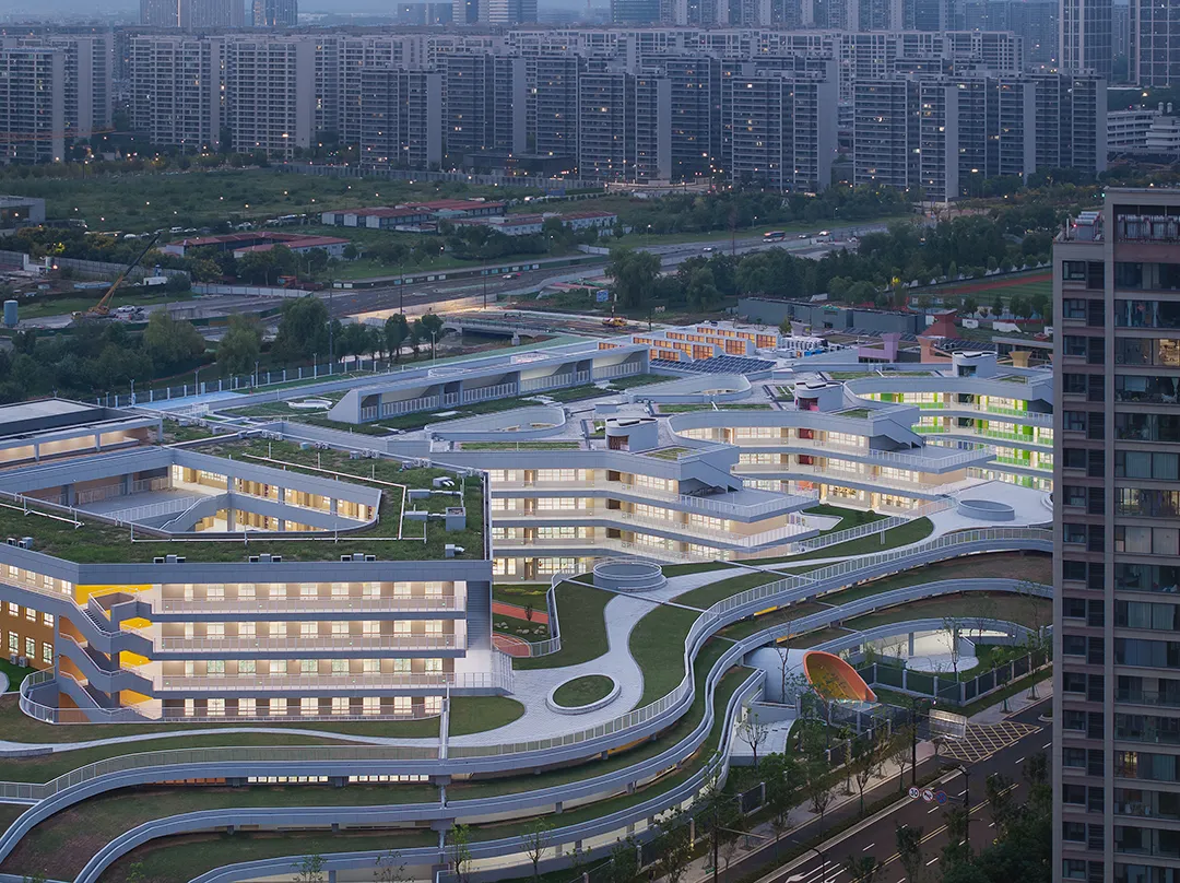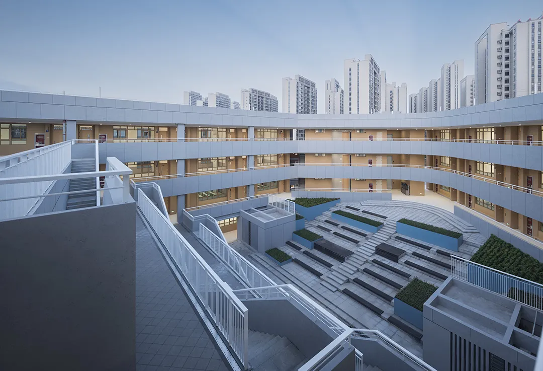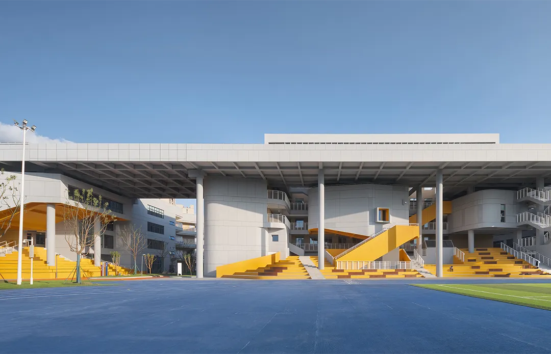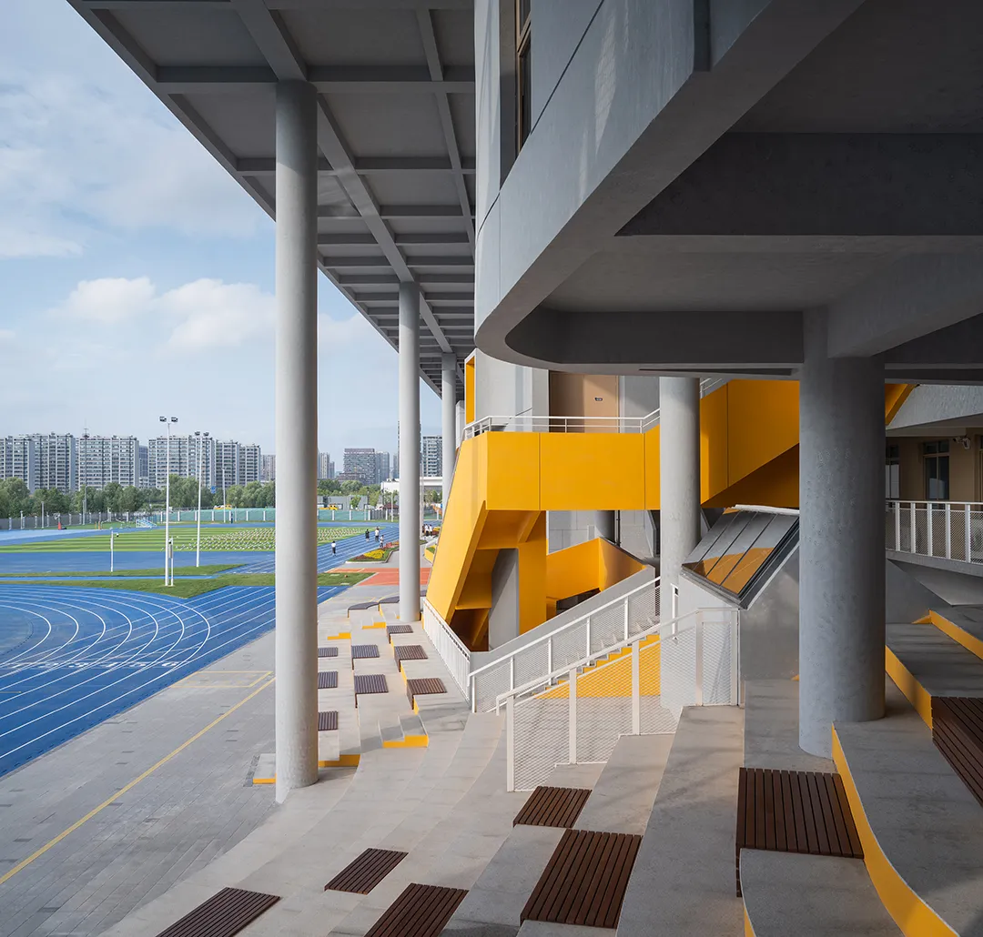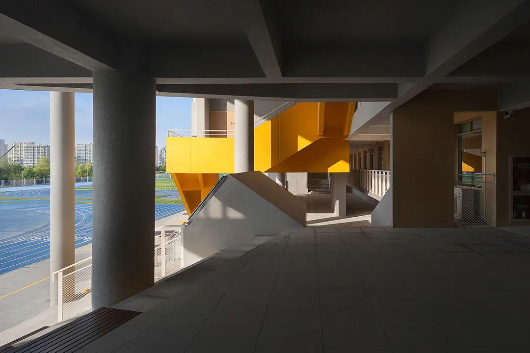 学校最好的呈现就是内部空间的外显,没有一个画面会比有实在学生活动的场景更加动人。建筑西侧隔着操场面向城市的干道,“剖切开”的建筑是最好的学习场景的展现。