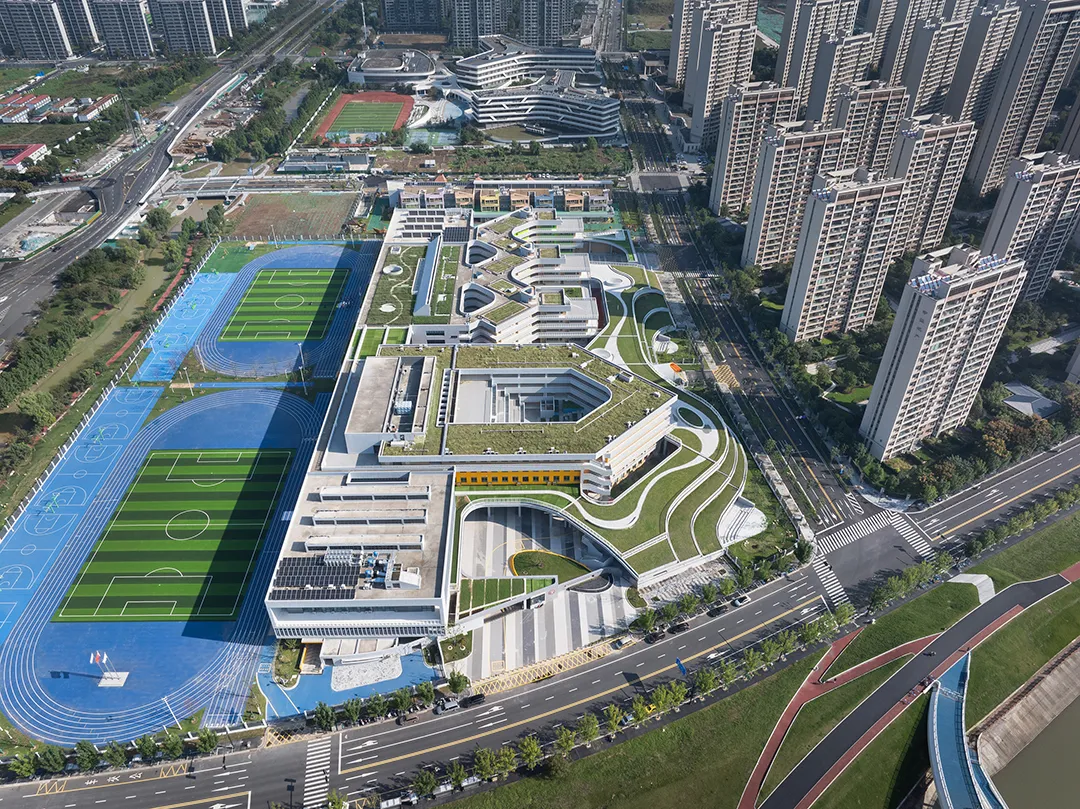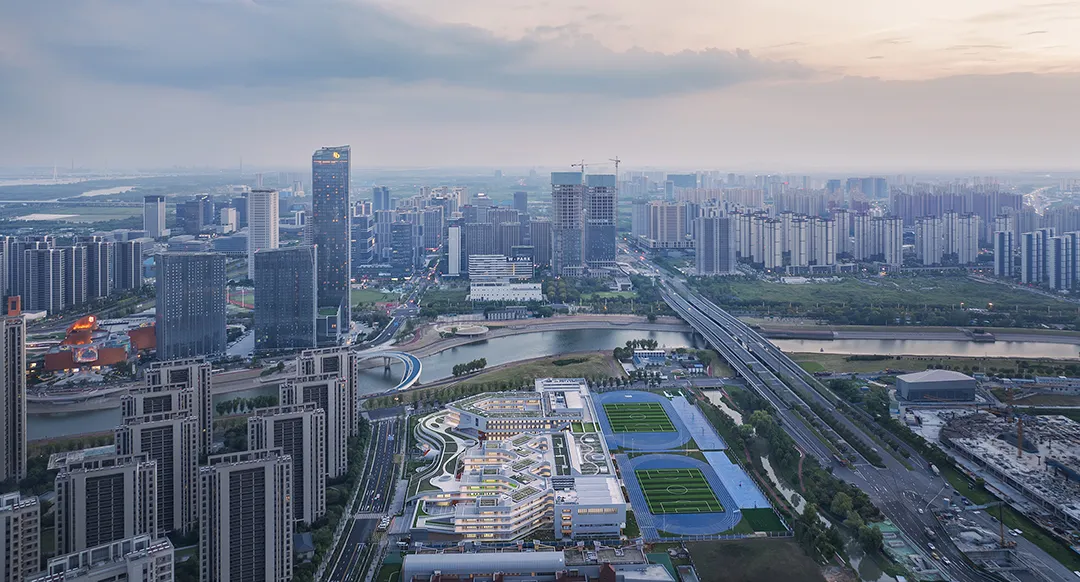 以住宅为主体的新城展现出来一种奇异的城市形象:南北向和东西向的不对等,整个城市似乎只有一个向度。因此康胜路明道学校沿东侧城市南北向形成了连续的空间,既形成了学校内部的共享空间,也为城市提供了另一个维度的景观。校园与城市共生共融,成为新城里的一抹亮色。