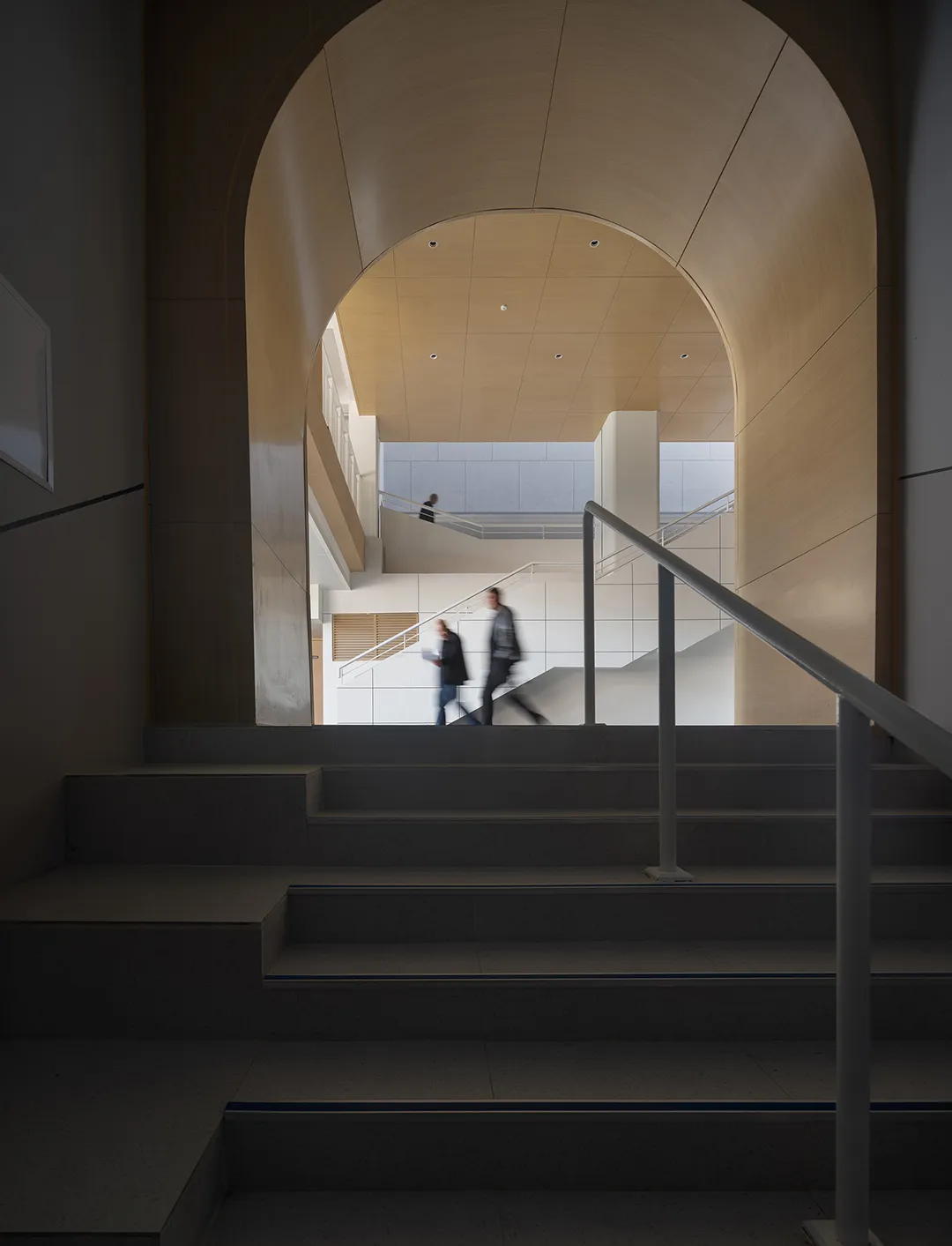 一个巨大的灰空间包含着不同标高的平台和功能用房,营造出一个活力的非正式学习空间。剖切的状态弱化的建筑实体,让在空间内活动的学生成为了建筑的主体呈现。