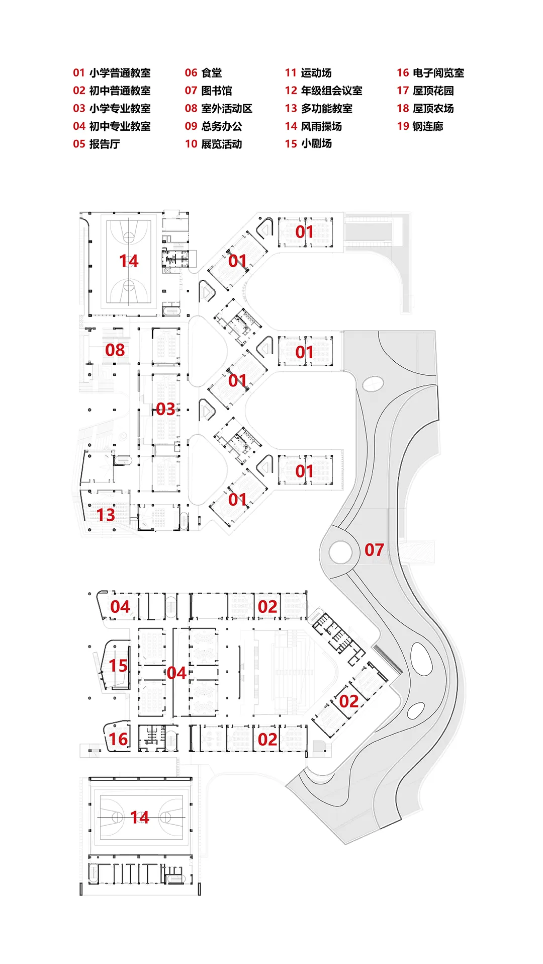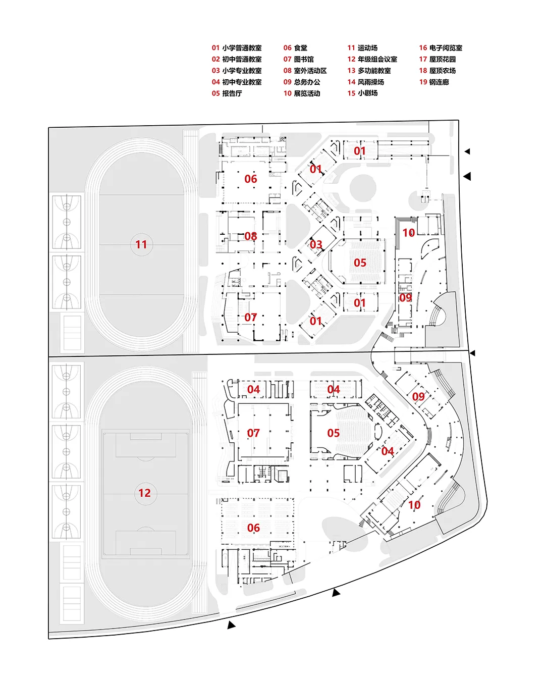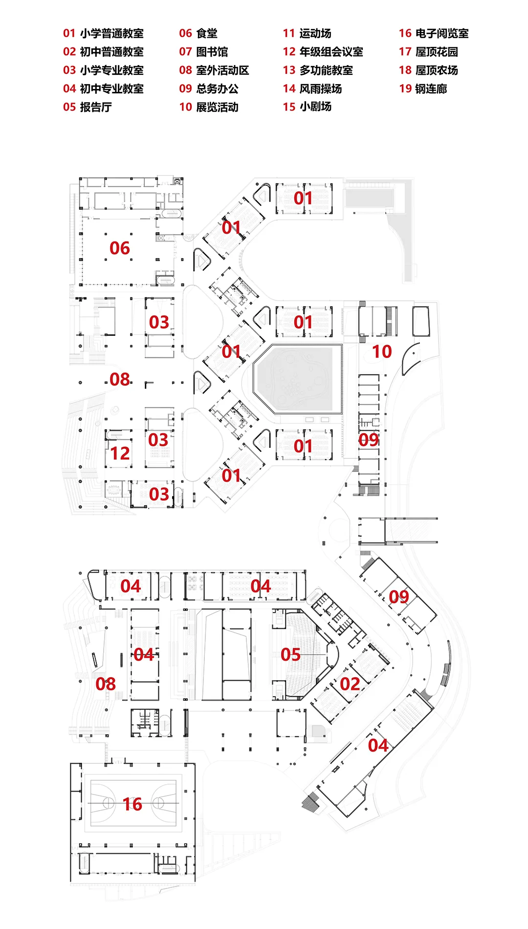 差异是九年一贯制学校的核心关键,也是人文主义的最大体现。小学和初中相邻,单元式的小学和集中式的设计是对不同年龄段学生特征的回应。巨大的西侧公共空间也体现这种差异。