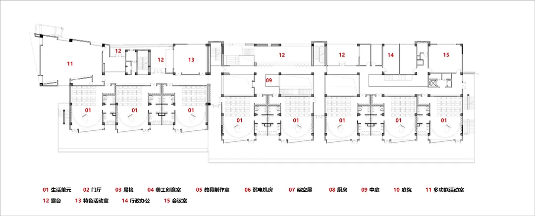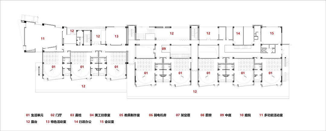 △ 中小学二层平面图 ©荣朝晖工作室+东南大学建筑学院+南京邦建