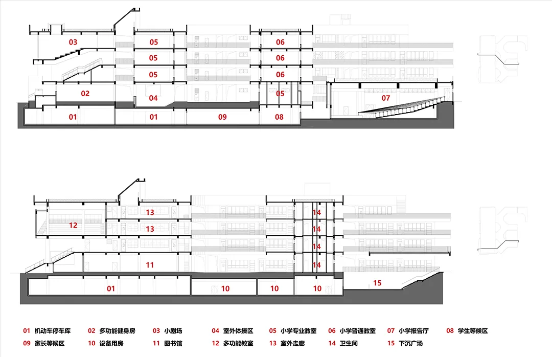 △ 小学剖面图 ©荣朝晖工作室+东南大学建筑学院+南京邦建