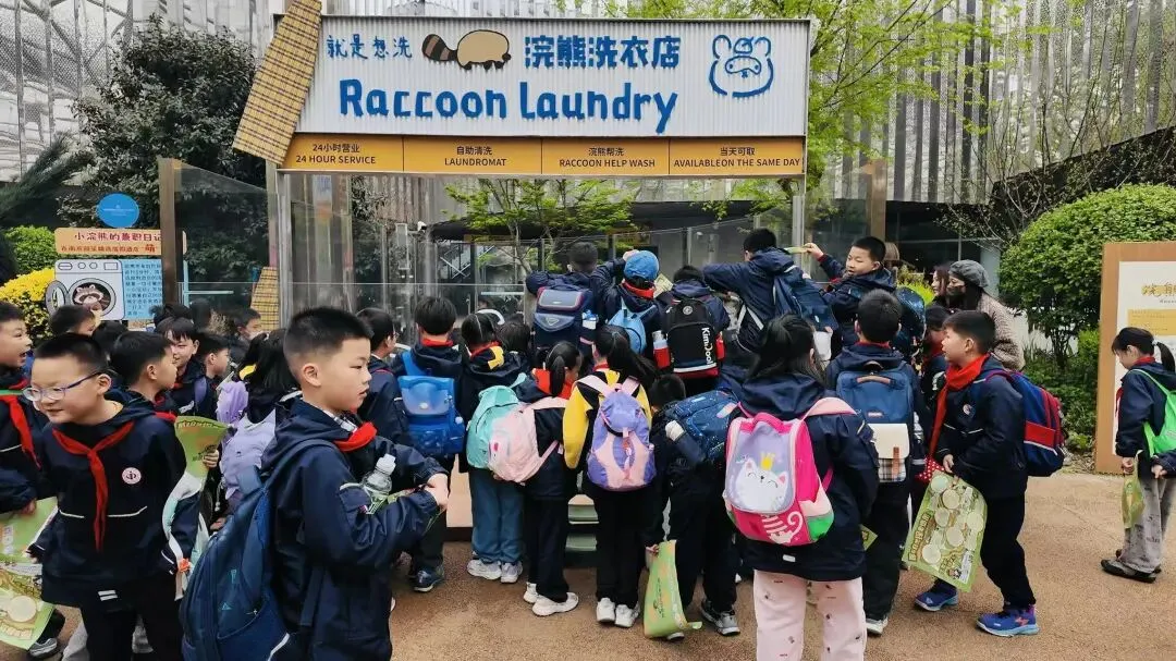 小浣熊@浣仔的洗衣店门前,娃娃们争先恐后地站成好几排,研学手册摊在膝盖上。带队老师指着玻璃里的小浣熊问:“谁知道小浣熊为什么总喜欢洗东西呀?”小朋友们齐刷刷举手,一个戴眼镜的小男孩抢答:“因为TA为了更好的感知食物!”