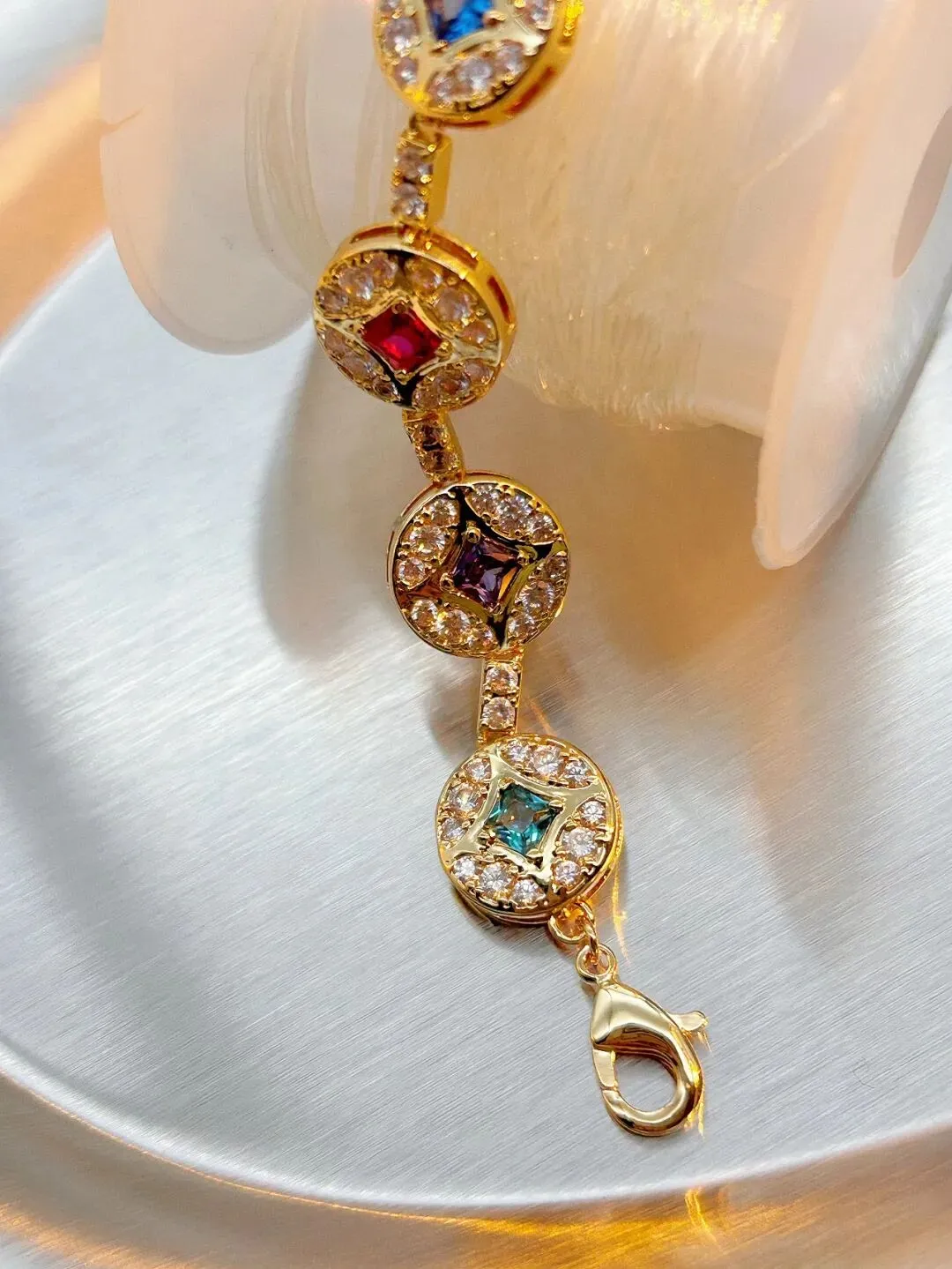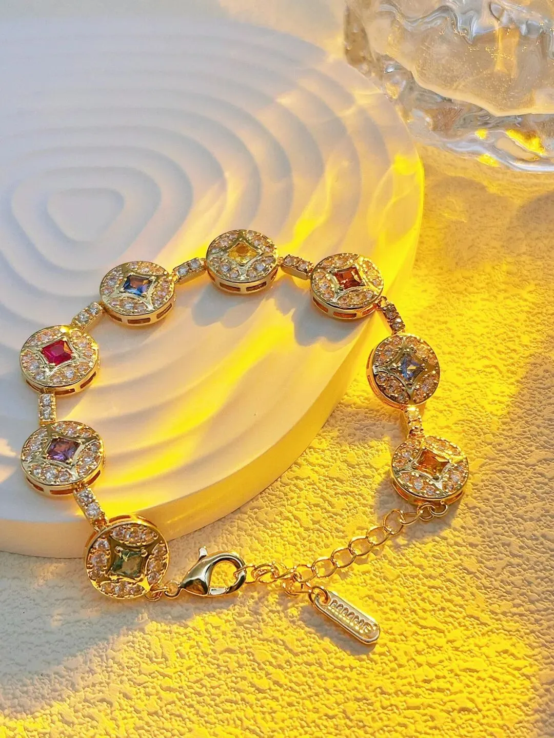对了,限量「💐点金石Nova」18K金色彩宝石手链🔥,现货发售了!灵感来源于古钱币,8枚钱币相连接。金色连接处均采用满钻设定,点缀有不同色彩锆石,尾牌镌刻MMNF品牌LOGO,手链总长21CM,长度可自行调节!