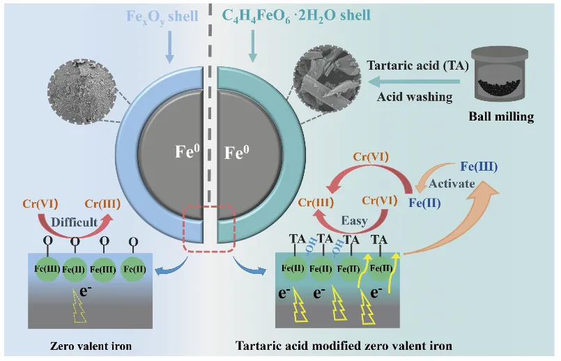 Cr(VI) 是地下水中一种典型的高毒性重金属污染物,微米零价铁 (mZVI) 因其强还原性被广泛应用于Cr(VI) 的修复,然而其表面极易形成惰性氧化层,导致电子传递效率低下,严重制约了实际应用效果。针对这一挑战,中国科学院南京土壤研究所钱林波副研究员团队提出了一种创新的表面配位工程策略。研究团队采用湿法球磨协同酒石酸(TA)表面配位工程,成功在mZVI表面构建了具有高反应活性的酒石酸亚铁二水合物(C₄H₄FeO₆·2H₂O)壳层。该壳层不仅替代了原有的惰性氧化层,更作一个高效的“电子穿梭体”,持续激活Fe(Ⅱ)/Fe(Ⅲ)氧化还原循环,实现了对Cr(VI) 的高效、持久还原。
