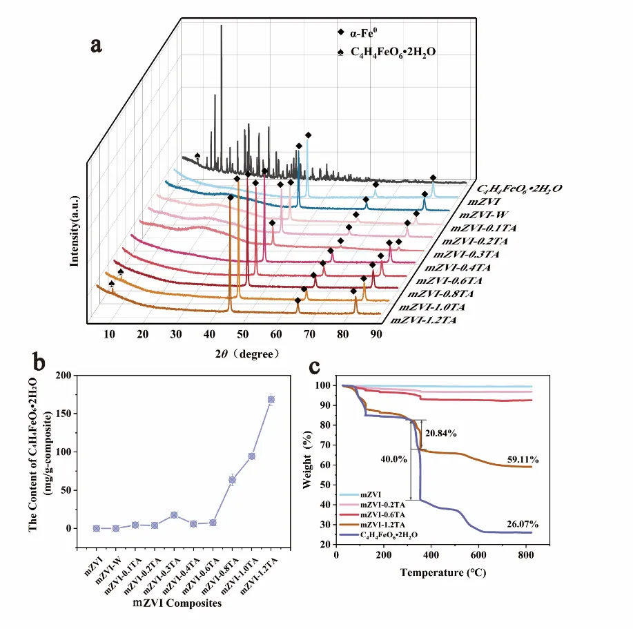 图1. (a) mZVI复合材料的XRD图;(b) mZVI复合材料上原位形成的C₄H₄FeO₆·2H₂O含量;(c) 热重曲线