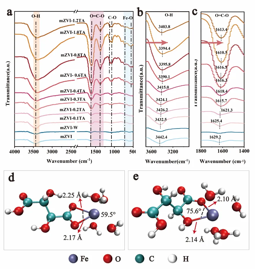图2. (a) mZVI复合材料的FTIR图谱;(b) O-H 和 (c) O═C-O 放大FTIR光谱; (c) DFT 计算的C₄H₄FeO₆·2H₂O 中 (d) 四元环和 (e) 五元环的配位结构