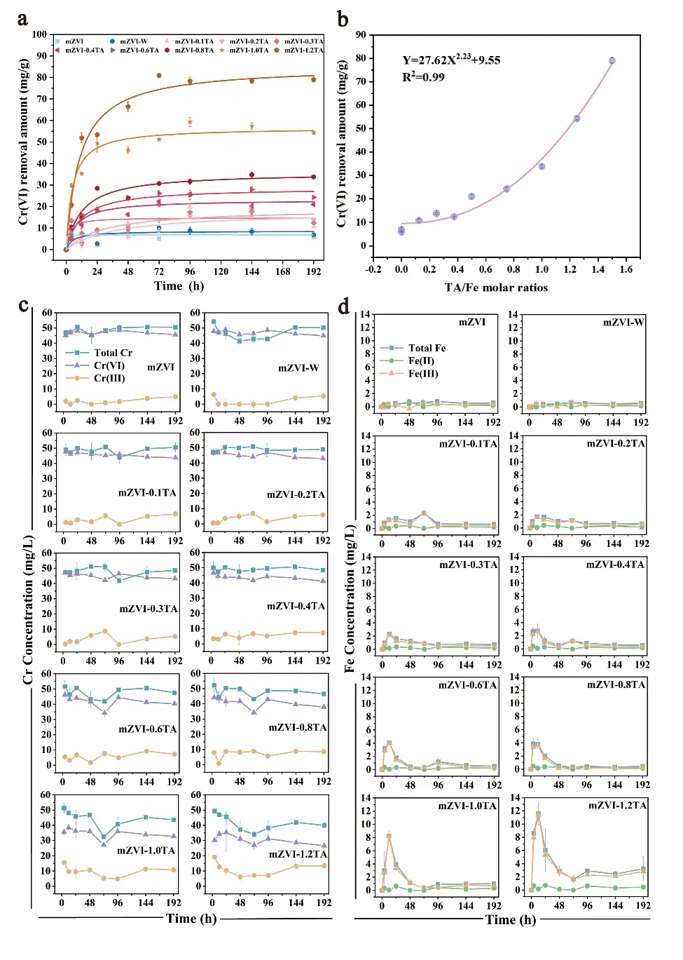 图3. mZVI 复合材料六价铬去除量随时间变化的动力学。(b) 六价铬去除量与 TA/Fe 摩尔比之间的关系。(c、d)mZVI 复合材料去除六价铬的动力学过程中(c)铬离子和(d)铁离子的种类和浓度变化。