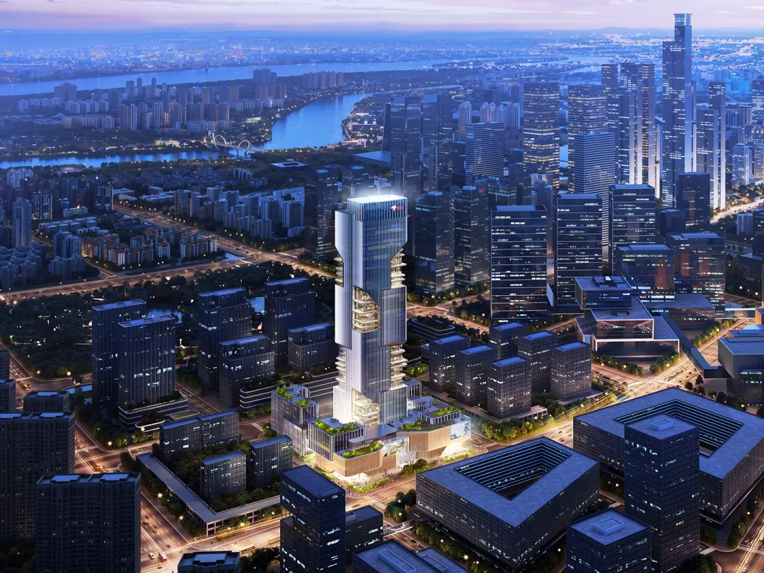项目由国际知名建筑师奥雷·舍人事务所设计,突破传统摩天楼单一形态,通过错动咬合的几何体块构建出极具张力的向上形态。建筑主体高200米,外立面采用动态线条与玻璃幕墙组合,在阳光下呈现积木般的多维视觉效果,既保证结构稳定性,又赋予建筑灵动的科技美感。主入口广场结合水景设计,流动的水元素与硬朗的建筑线条形成视觉对话,为科技建筑注入人文温度。