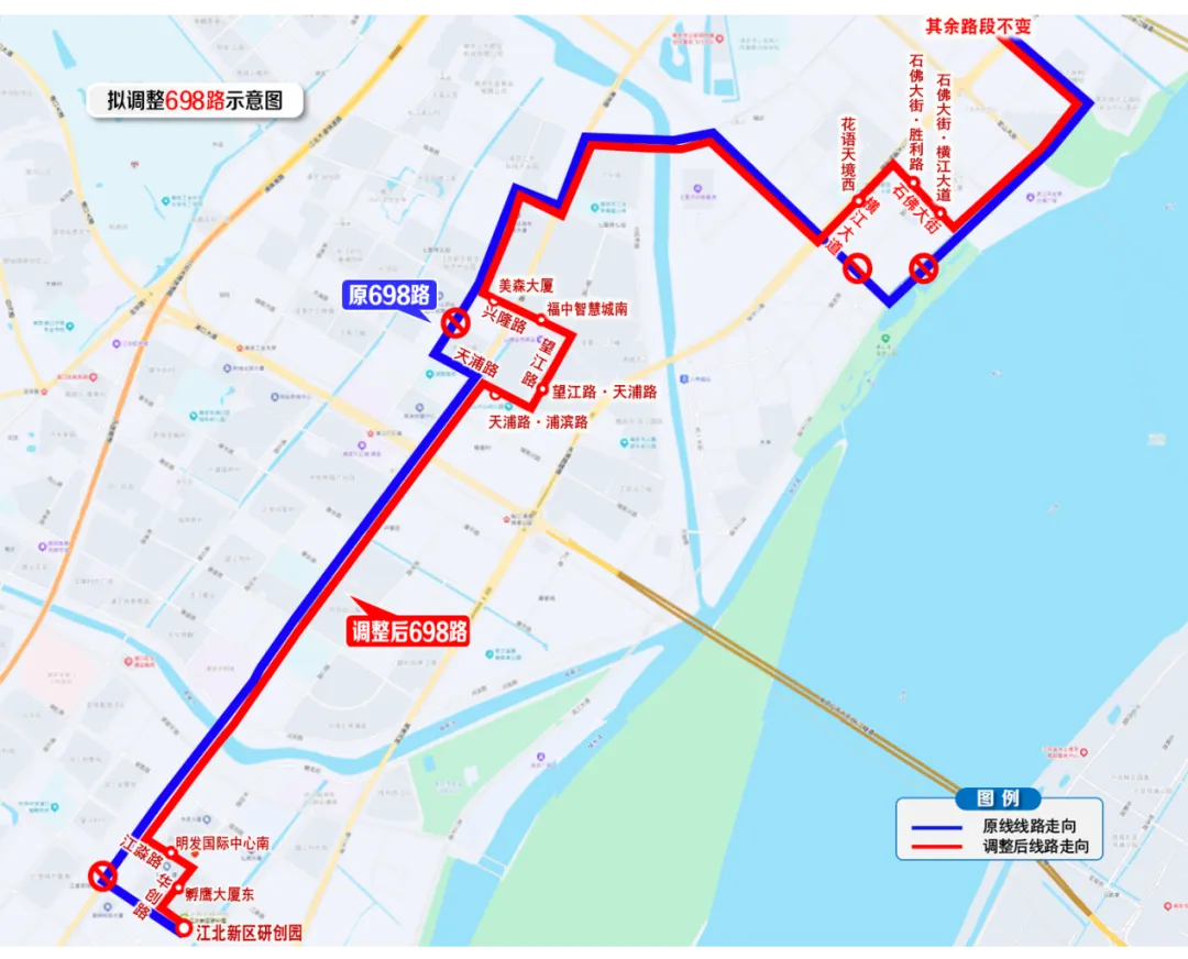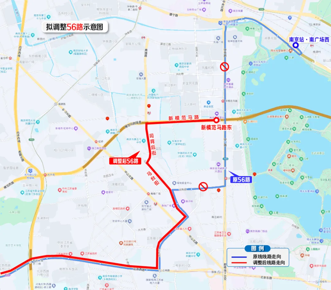* 走向变化:线路自“湖南路马台街”路口起,拟沿马台街、司背后街、新模范马路至终点站“新模范马路东”起讫(返程路段相同)。