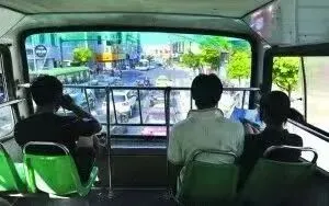 二层的前排座位,是当年的“黄金观景位”。道旁的梧桐枝繁叶茂,坐在窗边,漫窗的青翠扑面而来,枝叶偶尔擦过车顶簌簌作响,像穿行在一片流动的梧桐林海。