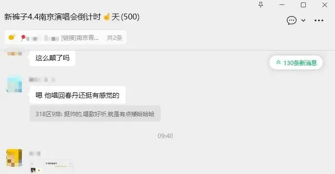 群名从“新裤子4.4南京演唱会倒计时8天”到“新裤子4.4南京演唱会倒计时1天”,在期待的喜悦中迎接四月四号的到来:到时候要伸手要周边、要记录、要在新裤子现场过27岁生日。
