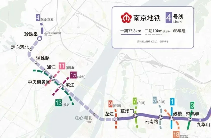 南京4号线二期是继地铁3号线、10号线、宁和城际一期后,南京建设的第四条过江地铁。从珍珠泉到龙江站,依次为:珍珠泉东站、瑞龙郊野公园站、石佛寺站、定山大街站、江北商务区站、江北市民中心站、江心洲站。
