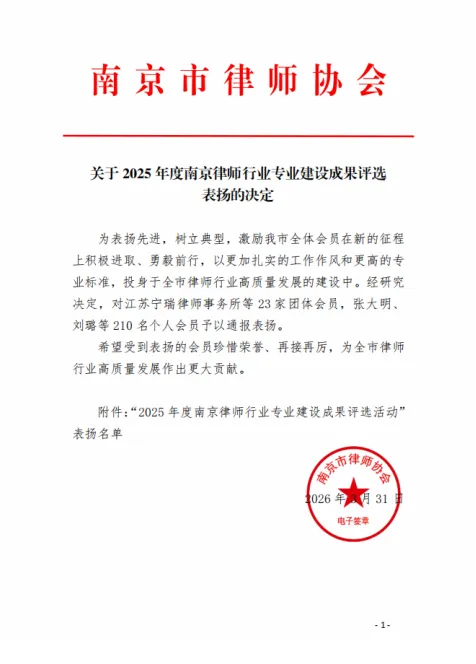 3 月 31 日,南京市律师协会发布《关于 2025 年度南京律师行业专业建设成果评选表扬的决定》,旨在表彰先进、树立典型,对在专业建设领域表现突出的律师会员予以通报表扬。